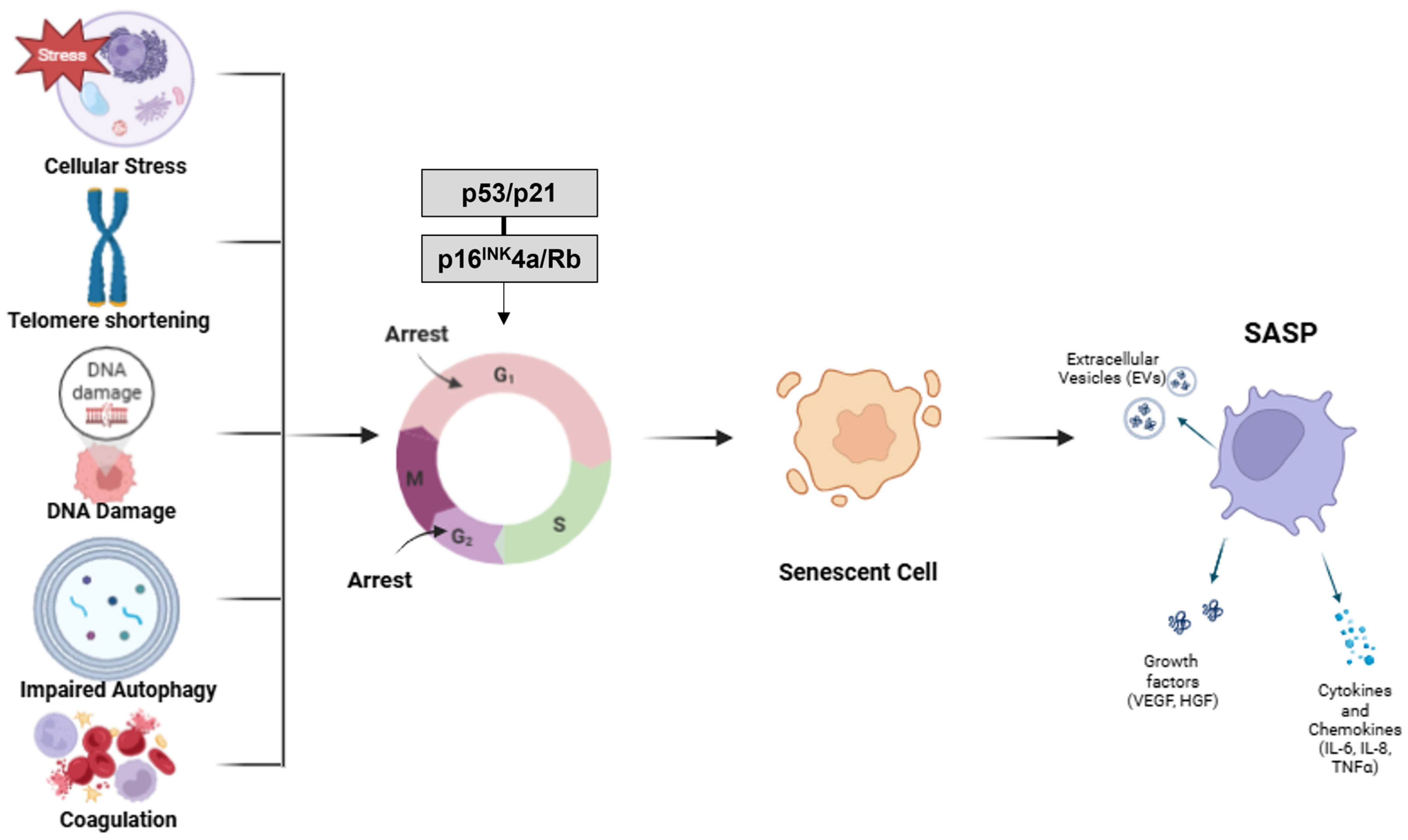 - Giroud, J.; Bouriez, I.; Paulus, H.; Pourtier, A.; Debacq-Chainiaux, F.; Pluquet, O. Exploring the Communication of the SASP: Dynamic, Interactive, and Adaptive Effects on the Microenvironment. Int. J. Mol. Sci. 2023, 24, 10788. [Google Scholar] [CrossRef]