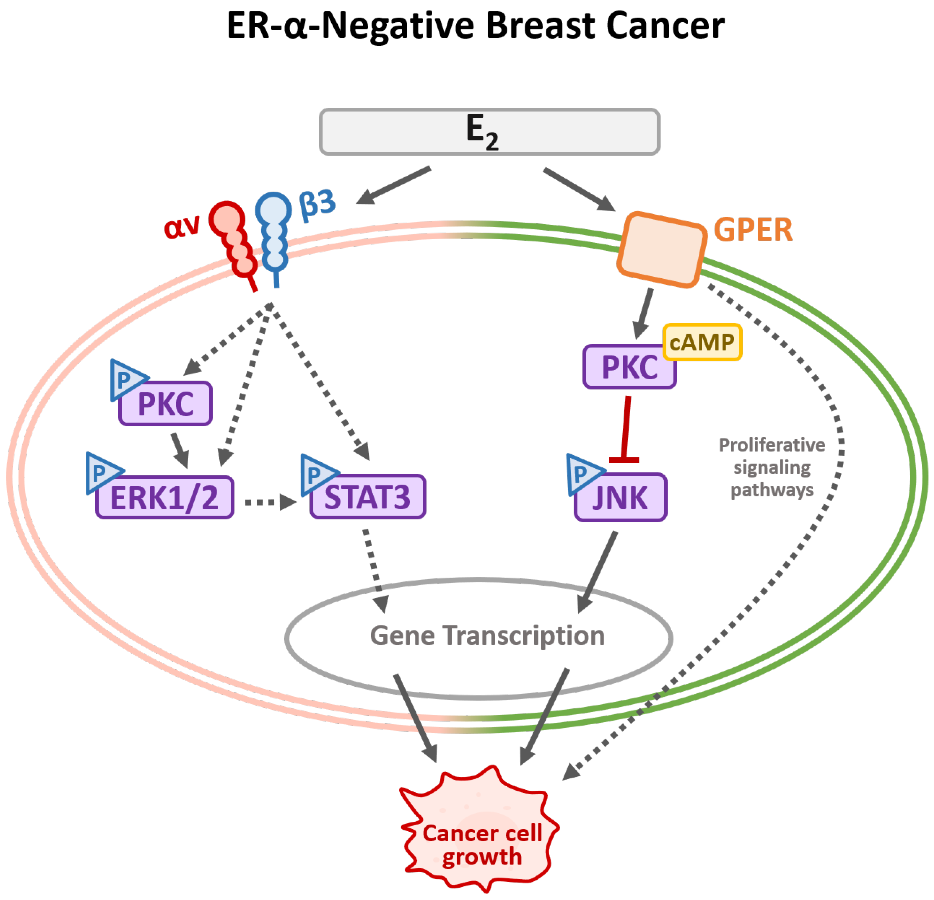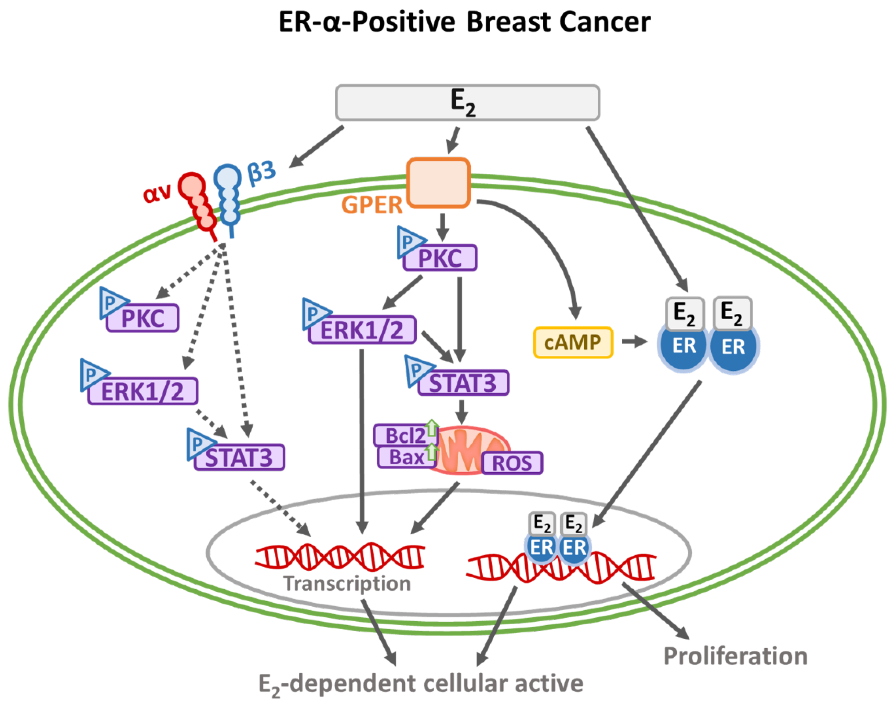 - Crosstalk among estrogen, integrin αvβ3, and GPER generates diverse cellular effects relevant to breast cancer biology.