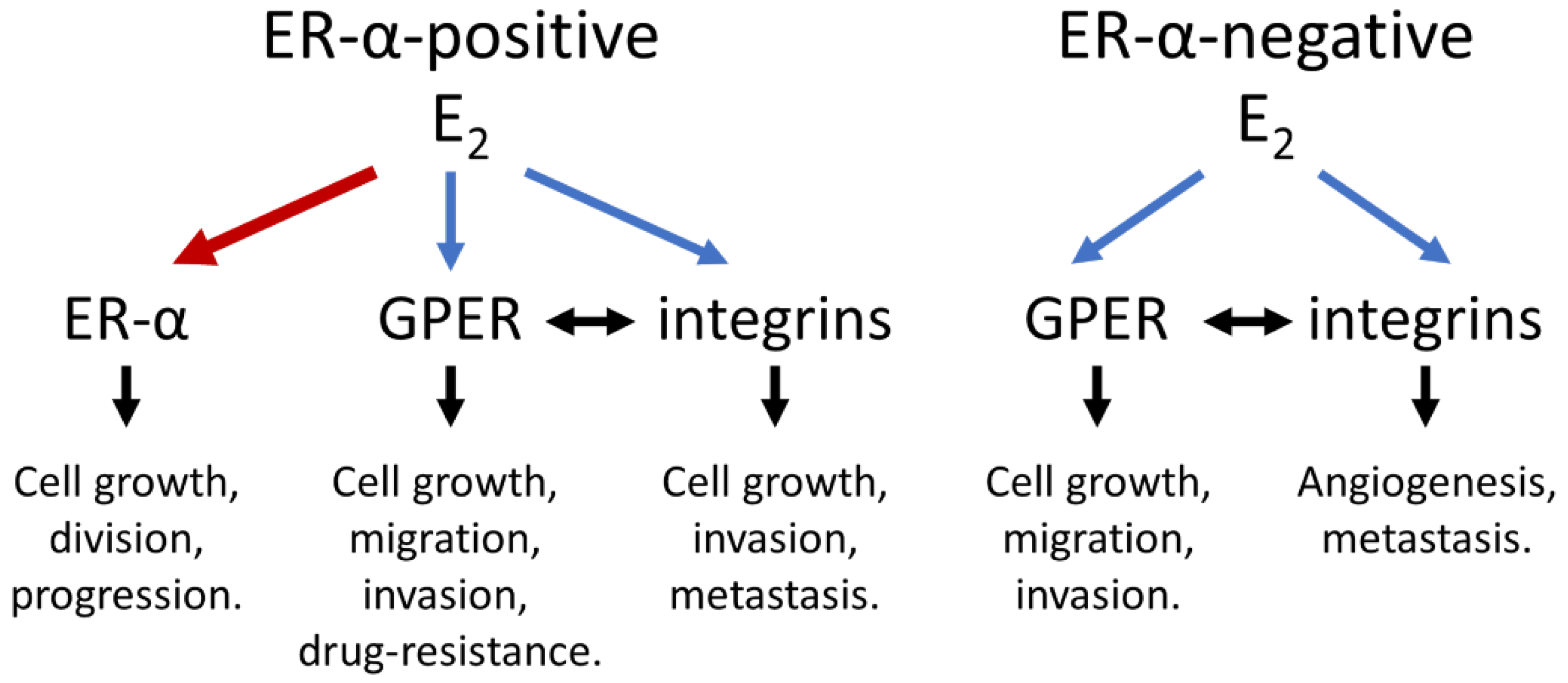 | Interaction with integrins | E2/ER-α signaling regulates integrin expression genomically [79] or activates non-genomic activities through crosstalk with pathways such as SRC/MAPK [80]. | E2/GPER activation transactivates RTKs like EGFR, which signal through integrins and associated complexes [81,82]. GPER can also directly activate integrins [75]. E2 directly binds with integrin αvβ3 to activate signals. |