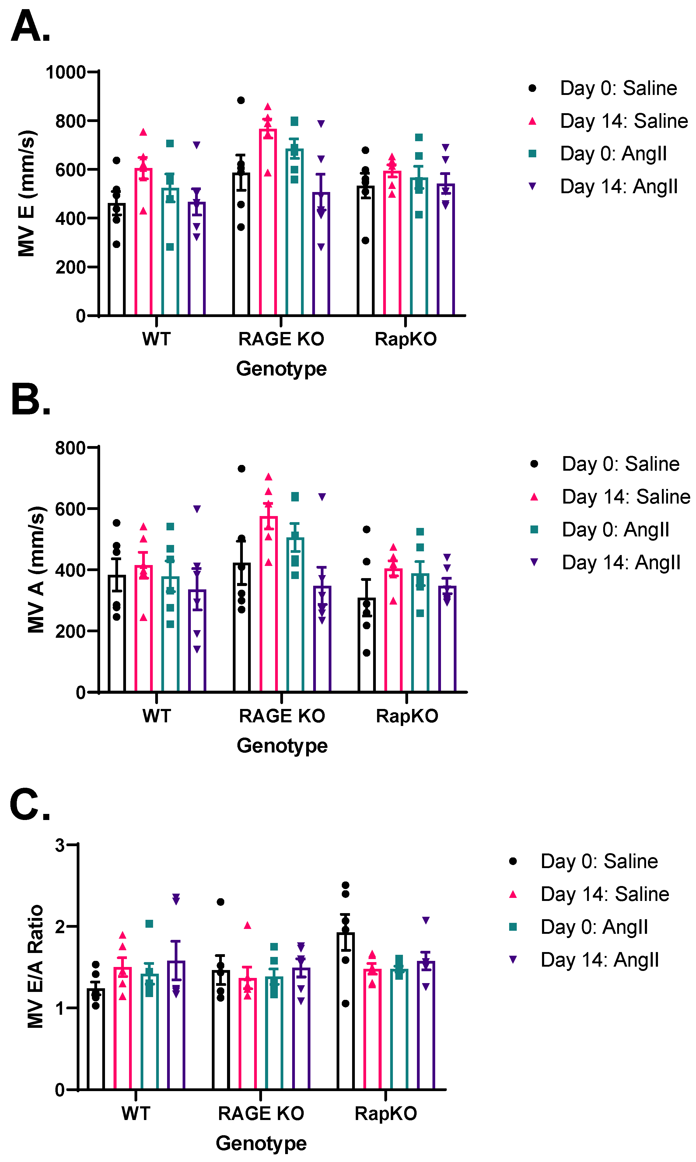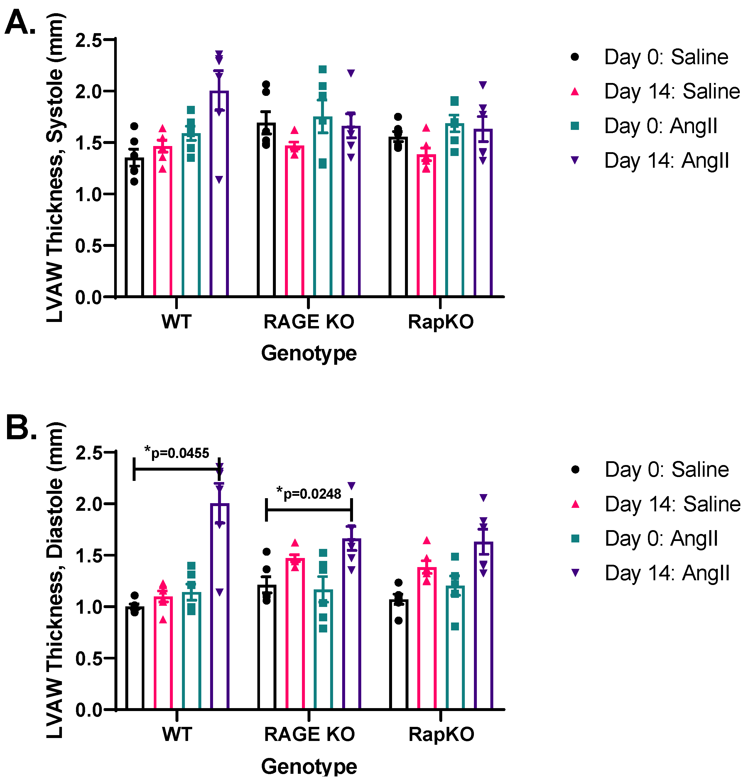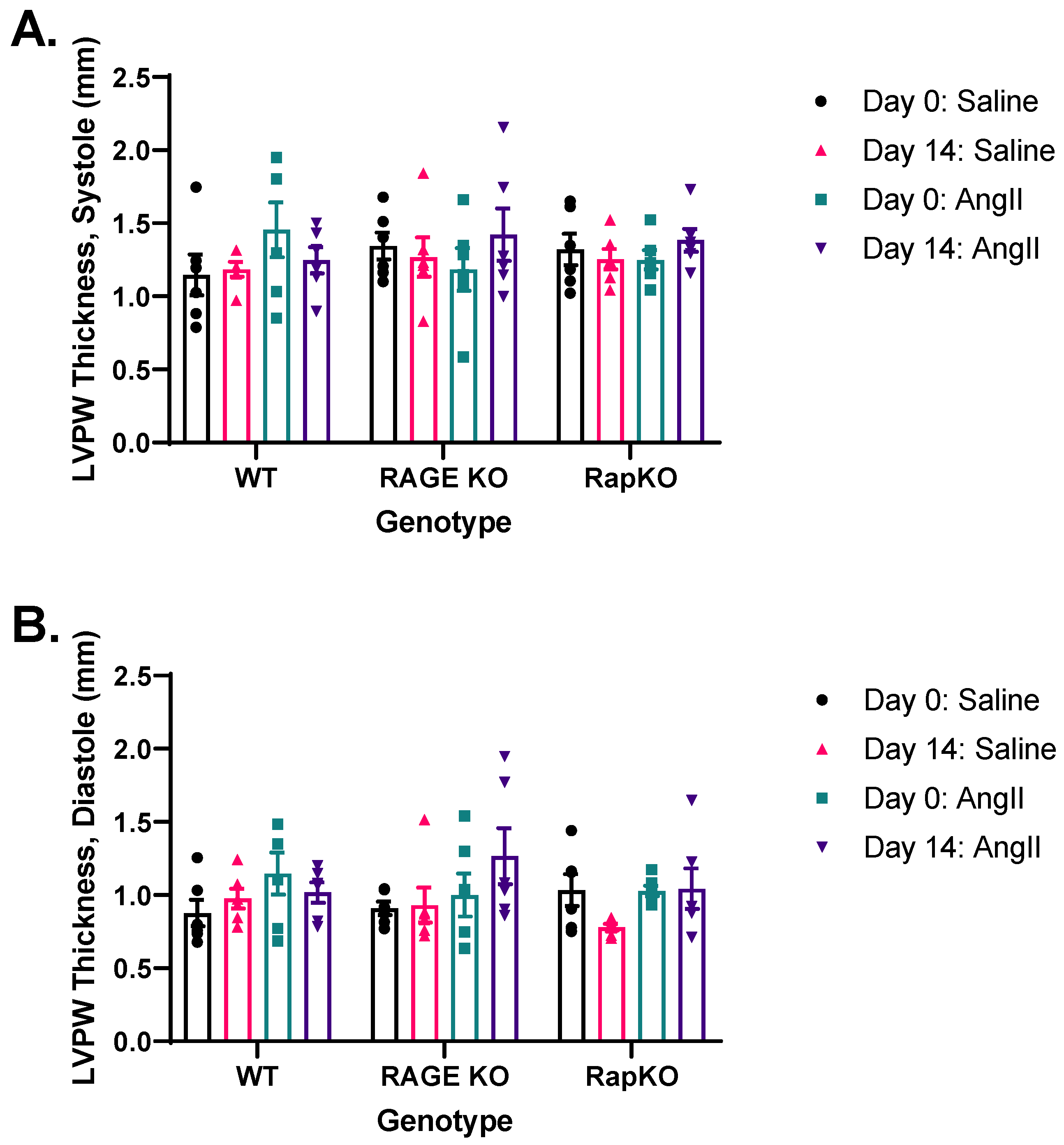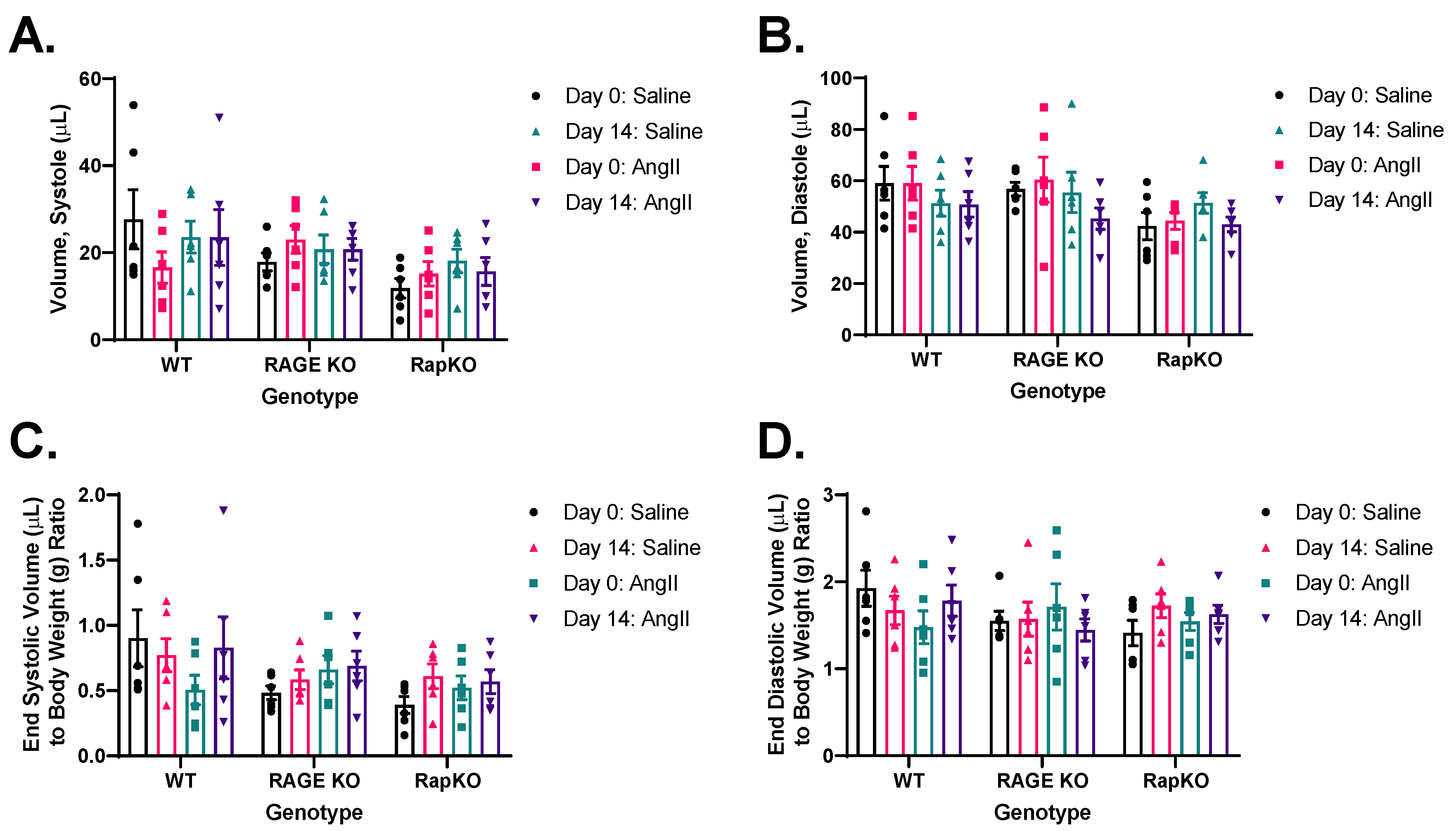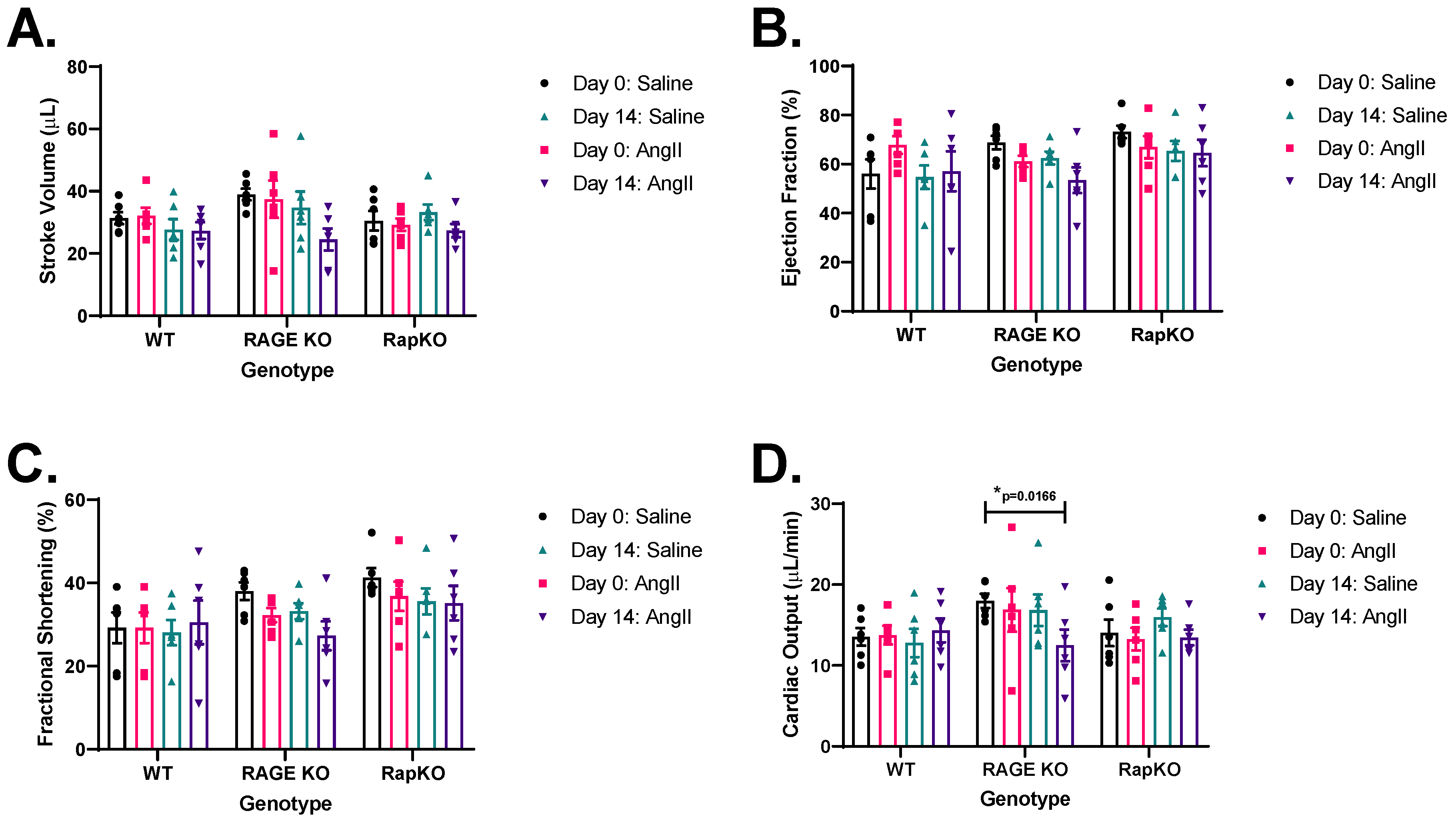 | Genotype | Day 0: Saline Mean (SEM) | Day 0: AngII Mean (SEM) | Day 14: Saline Mean (SEM) | Day 14: AngII Mean (SEM) |