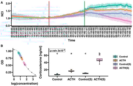 Effect of ACTH on proliferation (A) and corticosterone secretion (B) in primary cultures of rat adrenal cells. (A) Cell proliferation was continuously measured at 15 min intervals using the xCELLigence Real-Time Cell Analyzer (RTCA). The red line indicates the start of cell starvation, at which point charcoal-stripped serum medium (charcoal-stripped medium) was added to groups labelled “S”. The green line indicates the time at which ACTH was administered to the respective experimental groups. The RTCA chart presents mean normalised cell index (NCI) ± SD. (B) Corticosterone standard curve (left panel) with superimposed OD values for individual samples. The box plot (right panel) illustrates corticosterone levels across experimental groups. The Kruskal–Wallis test p-value is shown in the upper left corner of the plot. Results of Dunn’s post hoc test are indicated by different letters, with each letter representing statistically distinct groups. A uniform colour scale was applied to all charts, as presented in the legend on the right. Data represent mean ± SD from n = 6 biological replicates per group. Each data point on the box plot (panel B) represents an individual biological replicate from independent culture wells.