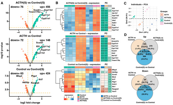 Transcriptomic analysis using microarrays. (A) Volcano plots illustrating differential gene expression for three pairwise comparisons: ACTH(S) vs. Control(S), ACTH vs. Control, and Control vs. Control(S). Genes meeting the significance threshold (adjusted p-value < 0.05 and fold change ≥ 1.8) are highlighted in red (downregulated) or turquoise (upregulated). The number of significantly downregulated and upregulated genes is indicated in the upper left and right corners of each plot, respectively. (B) Heatmaps showing the expression profiles of the 10 genes with the highest absolute fold-change values across comparisons. Each heatmap displays individual sample expression levels, gene symbols, and fold-change (FC). Numerical FC values are shown only for genes and comparisons that meet the predefined significance criteria (adjusted p-value < 0.05 and FC ≥ 1.8). (C) Principal component analysis (PCA) plot. Each point represents a single sample, colour-coded according to the experimental group. (D) Venn diagrams summarising the overlap of differentially expressed genes between comparisons. The upper diagram corresponds to significantly upregulated genes, while the lower diagram represents downregulated genes.