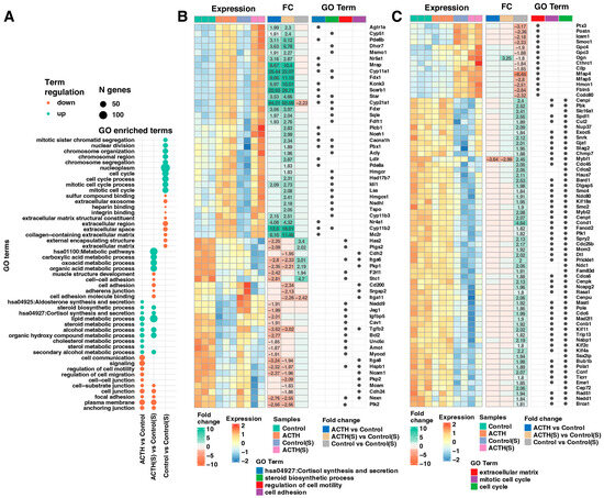 Functional Enrichment Analysis of Differentially Expressed Genes (DEGs). (A) Bubble plot illustrating the Gene Ontology (GO) enrichment analysis of DEGs. The top 10 upregulated and top 10 downregulated genes—ranked by adjusted p-value—were selected from three comparisons: ACTH(S) vs. Control(S), ACTH vs. Control, and Control vs. Control(S). DEGs were annotated and analysed using the DAVID database. (B,C) Combined heatmaps displaying the detailed expression profiles of DEGs associated with enriched GO terms. Panel (B) focuses on genes involved in the synthesis and secretion of cortisol, the steroid biosynthetic process, and the regulation of cell motility and adhesion. Panel (C) focuses on genes involved in the regulation of the cell cycle and the organisation of extracellular structures, including the extracellular matrix, the mitotic cell cycle and the cell cycle. In both panels, each row represents a gene and each column an individual sample. Gene symbols, expression profiles, and fold-change (FC) values are shown, with numerical FC values presented only for comparisons that meet the significance thresholds (adjusted p-value < 0.05 and FC ≥ 1.8). Additionally, dot annotations indicate the functional categorization of the genes.