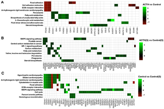 PathfindR Gene Enrichment Analysis. Enriched biological pathways were identified for three experimental comparisons: (A) ACTH vs. Control, (B) ACTH(S) vs. Control(S), and (C) Control vs. Control(S). The heatmap displays ten enriched pathways along the vertical axis, with the corresponding differentially expressed genes arranged horizontally. Colour-coded square annotations represent the log2 fold-change (log2FC) values.