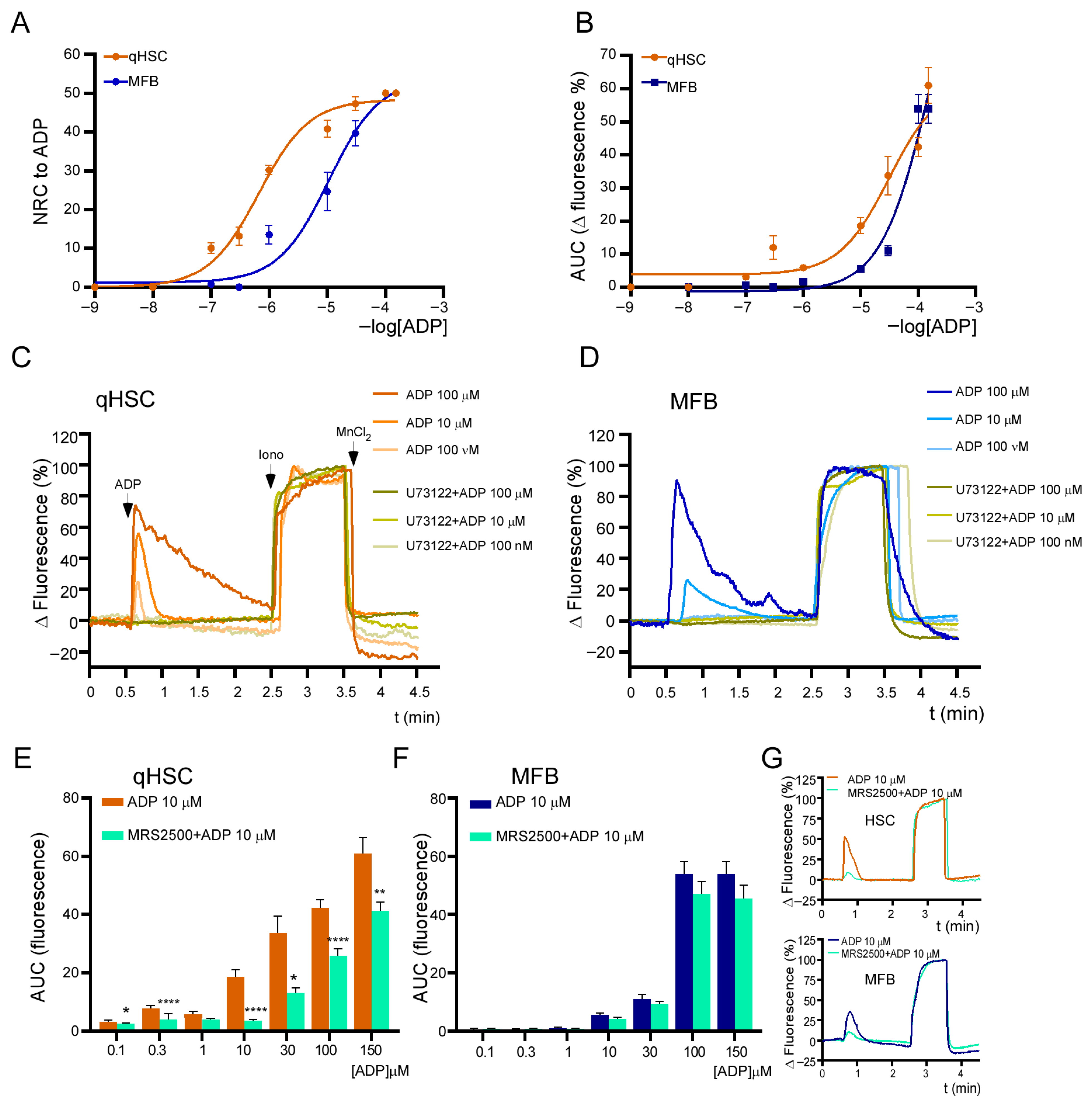 Figure 5. Calcium responses elicited by ADP in qHSC and MFB. Concentration–response curves in cultures of qHSC and MFB with concentrations of ADP ranging from 10 nM to 150 µM of ADP. The curves depict the number of responding cells (NRCs) (A) and area under the curve (AUC) (B). Representative traces showing the effect of 3 µM of the PLC inhibitor U73122 on the Ca2+ responses elicited by ADP (100 nM, 10 µM and 100 µM) in qHSC (C) and MFB (D). Effect of MRS2500, a selective antagonist of the P2Y1 receptor (2 µM), on the Ca2+ responses elicited by ADP (100 nM to 150 µM) in qHSC (E) and MFB (F). Representative traces of ADP at 10 µM in HSCs (upper panel) and MFBs (lower panel) (G). At least 50 cells were analyzed per experiment, n = 3. * p < 0.05, ** p < 0.01, **** p < 0.0001, Mann–Whitney test.