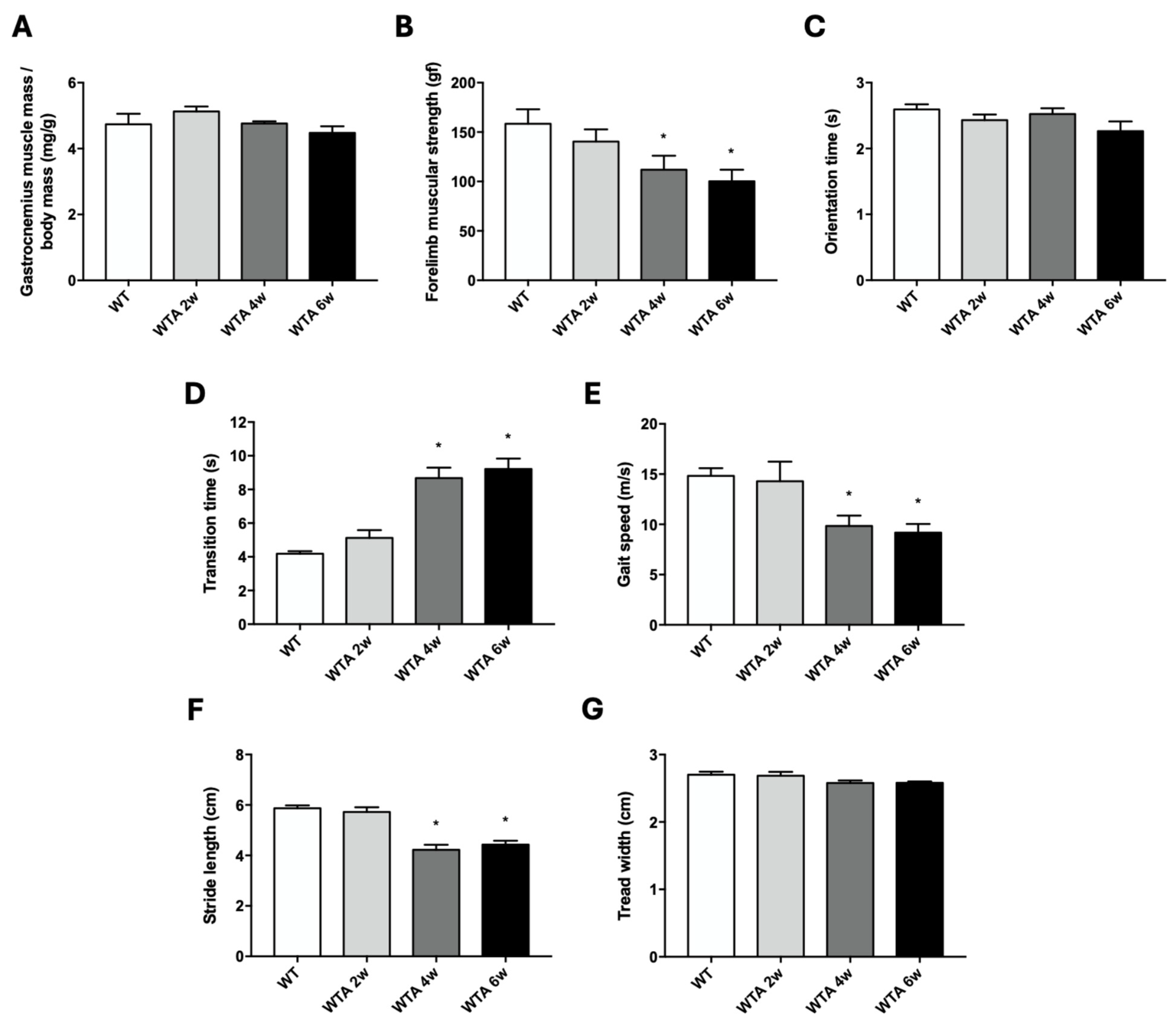 Figure 2. Adenine-rich diet decreases muscle strength and physical performance in mice. Mice were fed for 2, 4 and 6 weeks with a standard (WT) or a 0.2% adenine-supplemented diet (WTA). (A): Muscle mass was estimated analyzing the dry weight of gastrocnemius muscle and corrected by body weight (mg/g). (B): The bar graph shows the forelimb muscular strength (gf) measured by a grip strength test. (CE): Bar graphs show orientation time (s) (C), transition time (s) (D) and gait speed (cm/s) (E), analyzed by a static bar test. (F,G): Bar graphs show stride length (cm) (F) and tread width (cm) (G) analyzed using a gait and stride analysis test. All values are presented as the mean ± SEM. * p < 0.05 vs. WT. n: 6–8 animals/group.