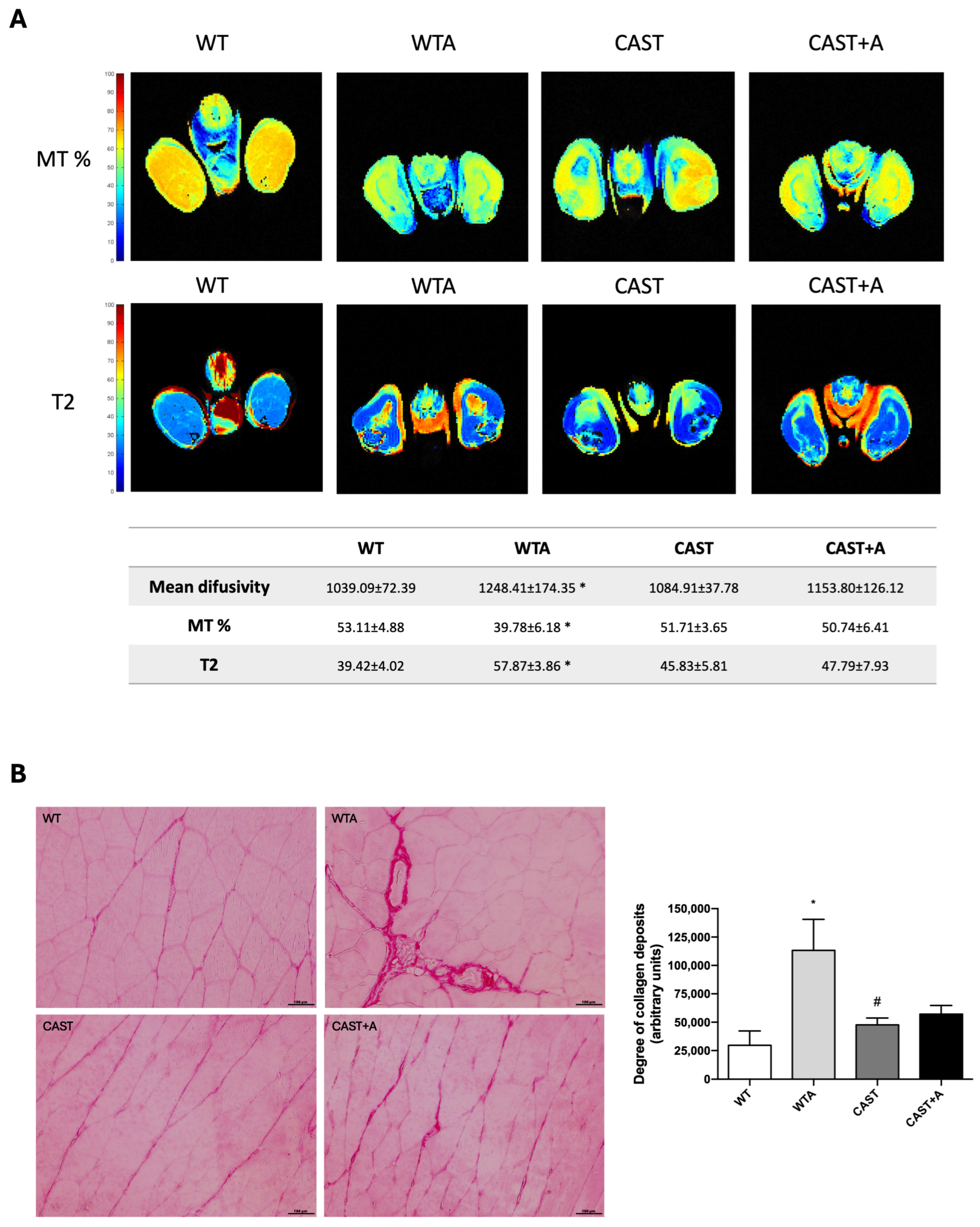 Figure 3. Calpastatin overexpression improves muscle structure damage and decreases gastrocnemius fibrosis in adenine-fed mice. Wild-type (WT) and calpastatin-overexpressing mice (CAST) were fed a standard or adenine-rich (WTA and CAST+A) diet for 4 weeks. (A): The mean diffusivity, percentage of magnetization transfer (MT%), and T2 relaxation time (T2) of the hind limbs were evaluated by nuclear magnetic resonance. An image of a representative experiment is shown. (B): Gastrocnemius collagen content was measured by Sirius red staining. An image of a representative experiment is shown. Scale bar: 100 µM. The bar graph represents the degree of collagen deposits. All values are presented as the mean ± SEM. * p < 0.05 vs. WT; # p < 0.05 vs. WTA. n: 6 animals/group.