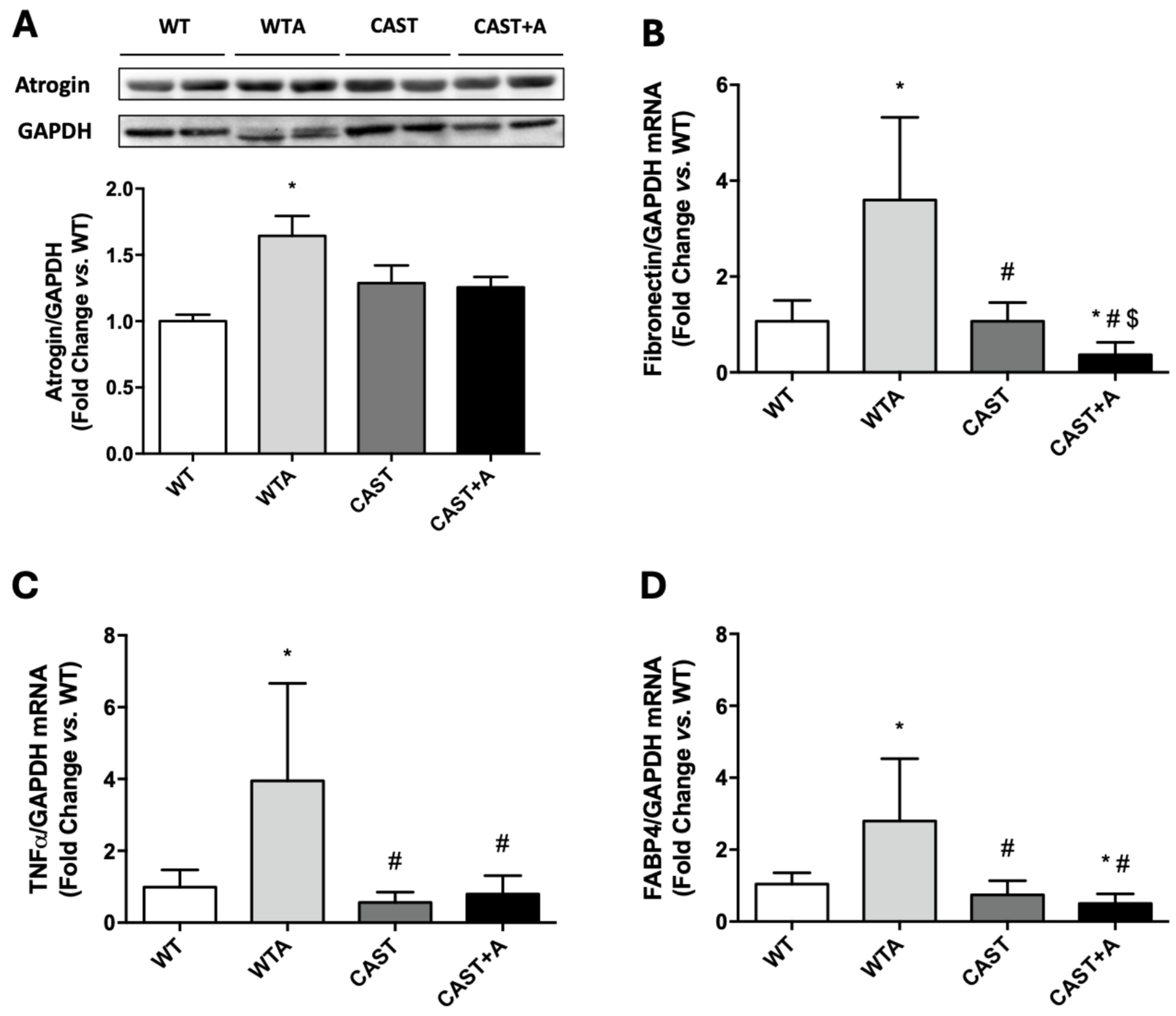 Figure 4. Calpastatin overexpression prevents muscle damage, fibrosis, inflammation and adiposis in the gastrocnemius of adenine-fed mice. Wild-type (WT) and calpastatin-overexpressing mice (CAST) were fed a standard or adenine-rich (WTA and CAST+A) diet for 4 weeks. (A): Atrogin protein content was evaluated by Western blot. An image of a representative blot is shown. The bars represent the normalized densitometric values of the blots against the endogenous control values versus WT. (BD): Bar graphs show fibronectin (B), TNFα (C) and FABP4 (D) mRNA expression, analyzed by RT-qPCR. Relative changes in mRNA content versus WT are plotted after normalization to total GAPDH content as an endogenous control. All values are presented as the mean ± SEM. * p < 0.05 vs. WT; # p < 0.05 vs. WTA; $ p < 0.05 vs. CAST. n: 7–9 animals/group.