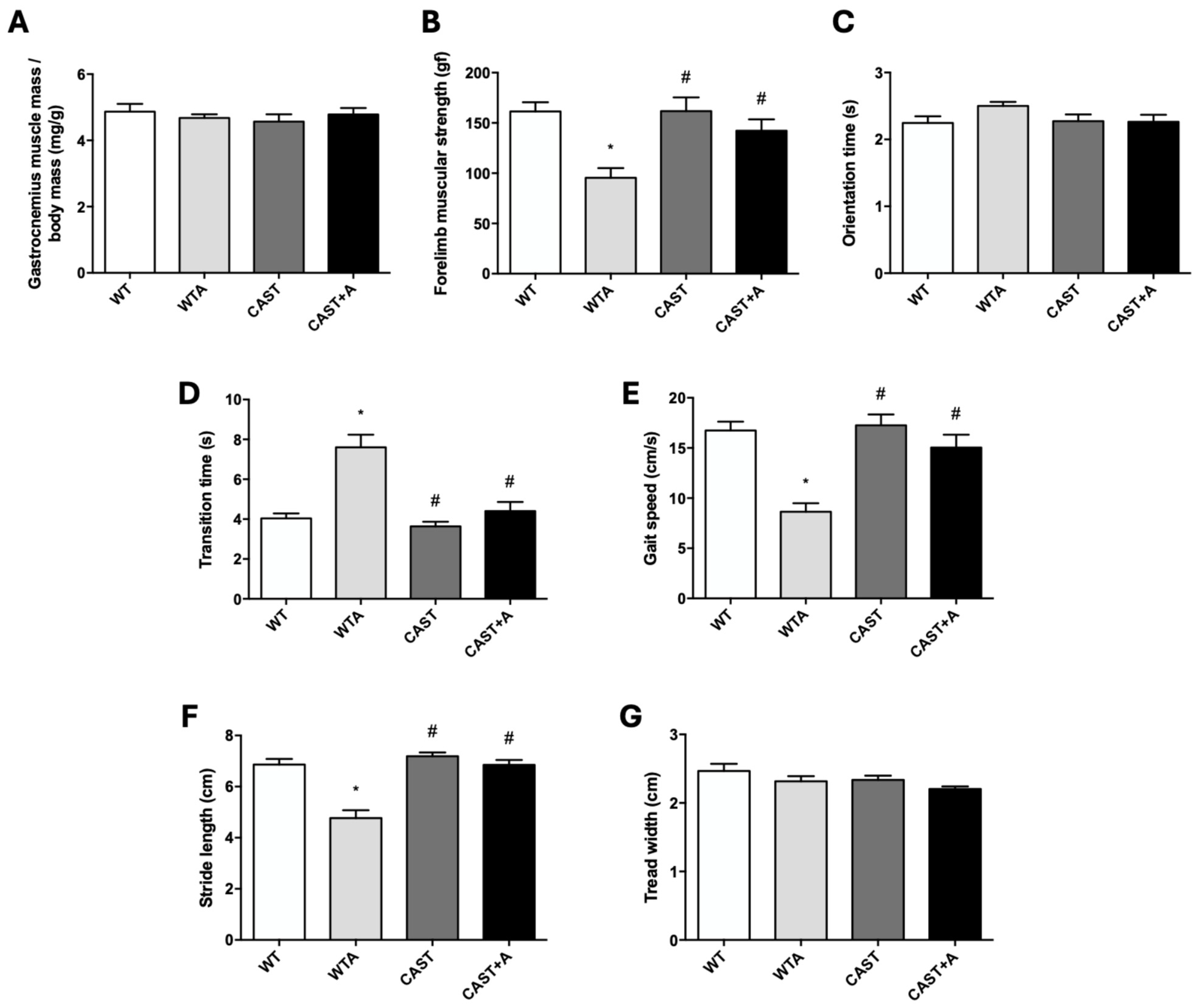 Figure 6. Calpastatin overexpression improves loss of muscle strength and physical performance of adenine-fed mice. Wild-type (WT) and calpastatin-overexpressing mice (CAST) were fed a standard or adenine-rich (WTA and CAST+A) diet for 4 weeks. (A): Muscle mass was estimated by analyzing the dry weight of gastrocnemius muscle and corrected by body weight (mg/g). (B): The bar graph shows the forelimb muscular strength (gf) measured by a grip strength test. (CE): Bar graphs show orientation time (s) (C), transition time (s) (D) and gait speed (cm/s) (E), analyzed by a static bar test. (F,G): Bar graphs show stride length (cm) (F) and tread width (cm) (G) analyzed using a gait and stride analysis test. All values are presented as the mean ± SEM. * p < 0.05 vs. WT; # p < 0.05 vs. WTA. n: 12 animals/group.