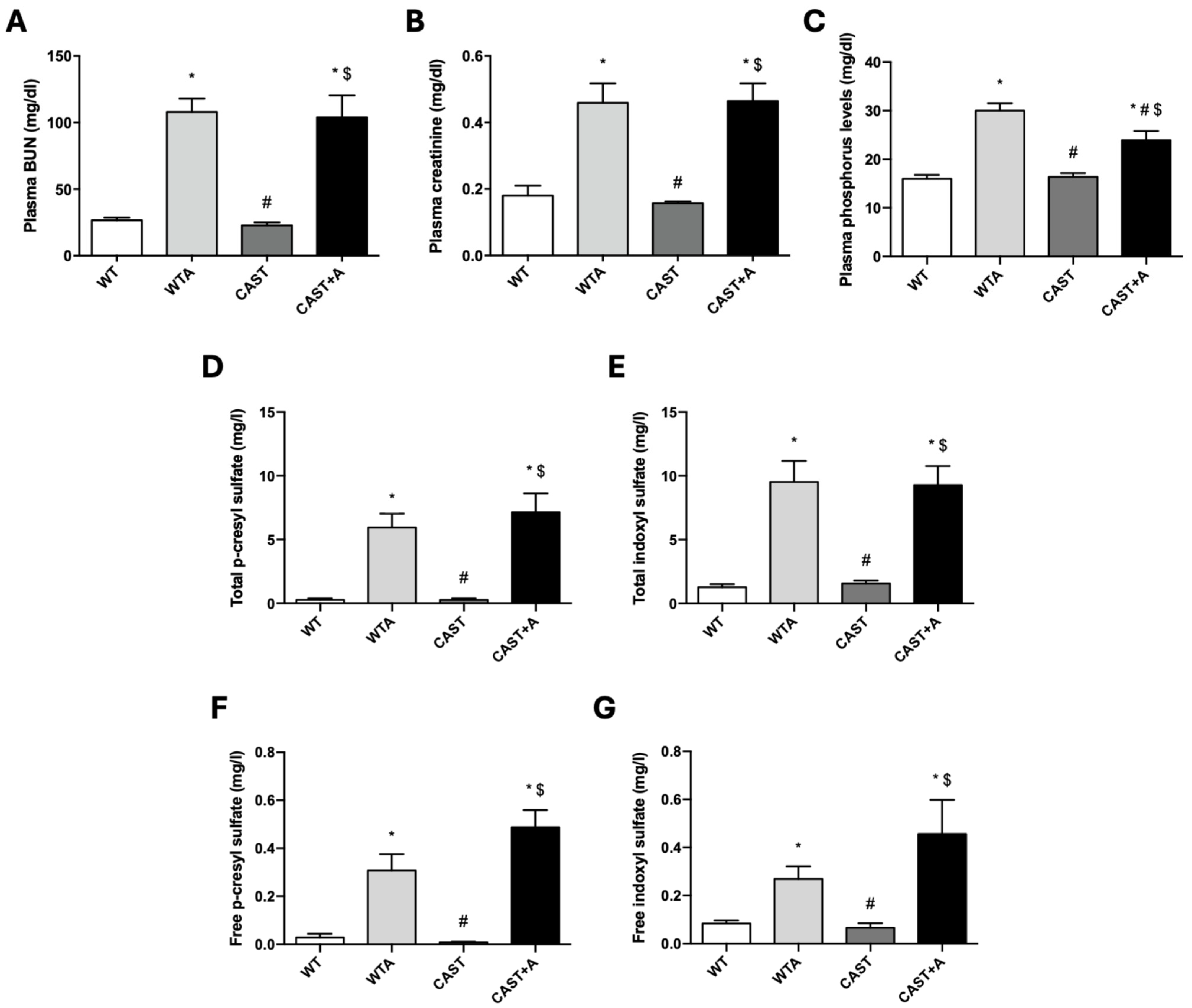 Figure 7. Calpastatin overexpression does not modify renal function in adenine-fed mice. Wild-type (WT) and calpastatin-overexpressing mice (CAST) were fed a standard or adenine-rich (WTA and CAST+A) diet for 4 weeks. (AC): Bar graphs show the levels of BUN (blood urea nitrogen) (mg/dL) (A), plasma creatinine (mg/dl) (B), and plasma phosphorus (mg/dL) (C), analyzed by colorimetric assays. (DG): Bar graphs show total p-cresyl sulfate (pCS) (D) and indoxyl sulfate (IS) (E); and free pCS (F) and IS (G) plasma levels (mg/L), analyzed by UHPLC-MS /MS. All values are presented as the mean ± SEM. * p < 0.05 vs. WT; # p < 0.05 vs. WTA; $ p < 0.05 vs. CAST. n: 7–8 animals/group.