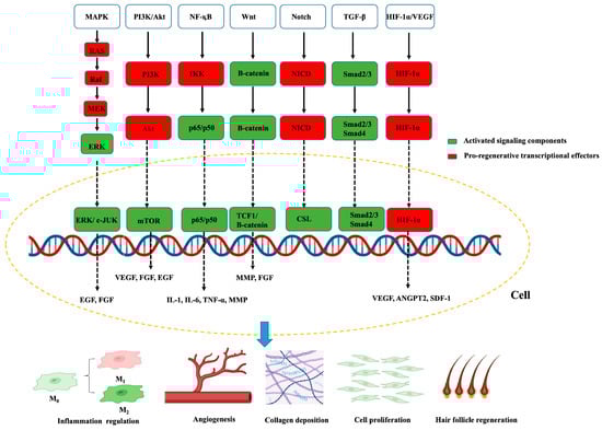 Key intracellular signaling pathways involved in wound healing. Red boxes indicate activated signaling components; green boxes denote transcriptional effectors promoting tissue regeneration. Arrows indicate direct activation steps, whereas dashed arrows denote nuclear translocation and transcriptional regulation. The yellow dashed circle outlines the cellular context in which pathways operate, with convergence at the level of gene transcription. The lower schematic links these pathways to major cellular outcomes, including macrophage polarization, angiogenesis, collagen deposition, fibroblast proliferation, and hair-follicle regeneration. Created by the authors.