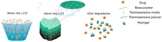 Hydrogel drug delivery system for in situ formation of scaffolds. A schematic depicting a thermo-responsive hydrogel that remains liquid during application but solidifies into a gel upon warming to body temperature, above its Lower Critical Solution Temperature (LCST), forming a scaffold within the wound. Reprinted from Ref. [].