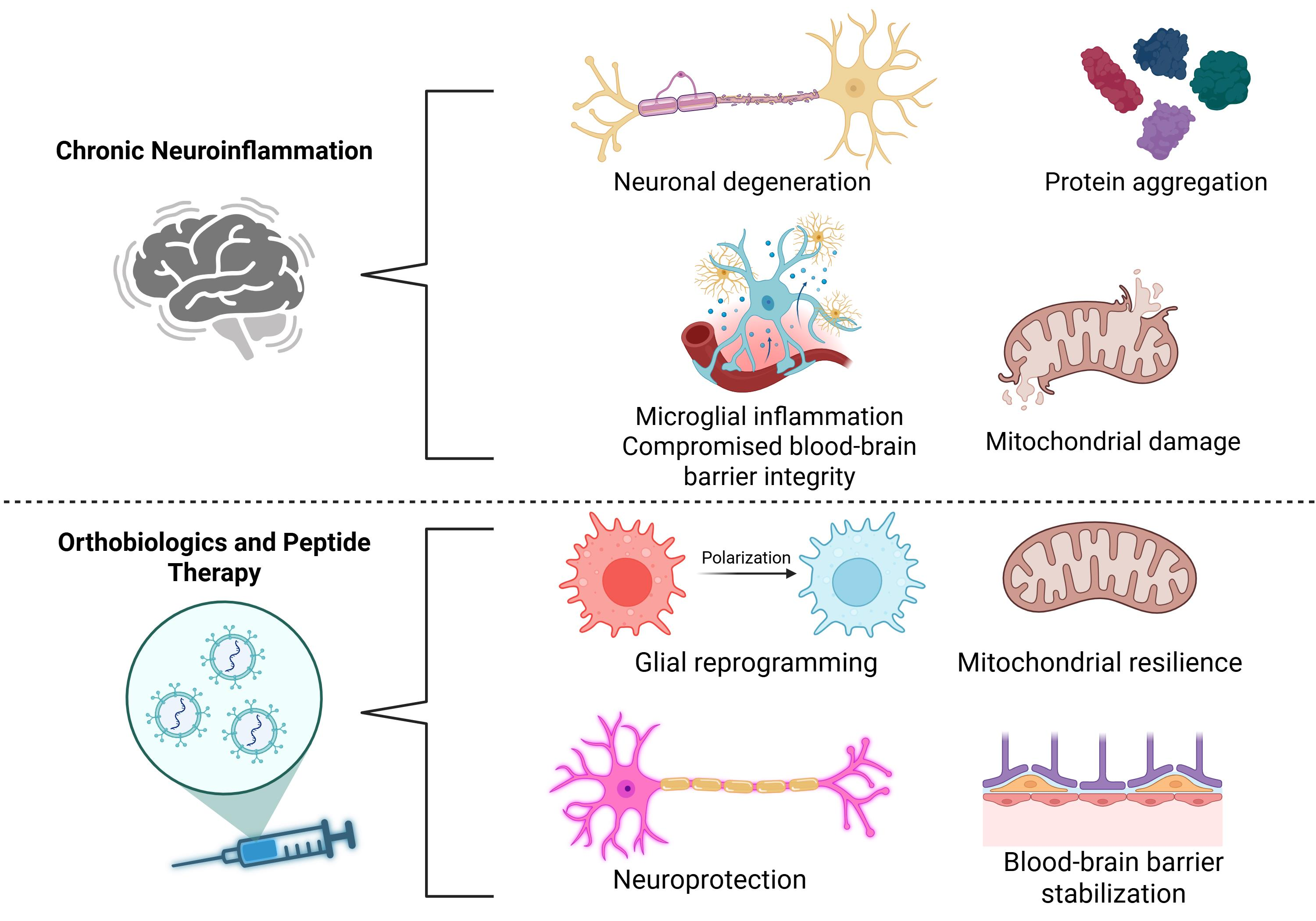 - Orthobiologic derivatives and peptide therapeutics converge on shared neurodegenerative pathways, promoting mitochondrial resilience, glial reprogramming, and synaptic repair.