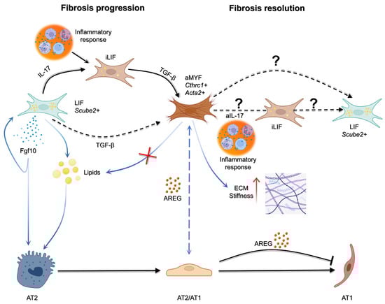 Cellular interactions driving fibrosis progression and resolution. During injury, inflammatory cues such as IL-17 promote the emergence of inflammatory LIF+ fibroblasts (iLIF), which in turn release TGF-β to drive activation of myofibroblasts (aMYF; Cthrc1+ Acta2+). Activated fibroblasts reinforce fibrosis in the epithelial side through AREG stalling the epithelium in an intermediate state. In contrast, LIF+ fibroblasts (Scube2+) can provide pro-regenerative signals, including Fgf10 and lipids, that support alveolar type 2 (AT2) cell survival and differentiation into alveolar type 1 (AT1) cells. The balance between these pathways determines outcome: persistence of aMYF activity promotes fibrosis progression, while the potential reversion or remodeling of fibroblast states (aIL-17, iLIF, or LIF+ populations) may underlie fibrosis resolution. To date, no evidence indicate the reversion of aMYF to LIF through iLIF and it would be of interest to be studied. Figure created with BioRender.com.
