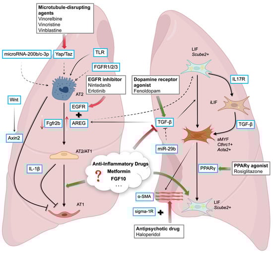 Therapeutic targets and signaling pathways in alveolar repair and fibrosis. Multiple pathways regulate the balance between alveolar epithelial regeneration and fibrotic remodeling. In AT2 cells, Wnt/β-catenin signaling and EGFR/AREG activity promote differentiation towards complete AT1 or AT2/AT1, respectively. EGFR inhibitors (e.g., nintedanib, erlotinib) and dopamine receptor agonists (e.g., fenoldopam) can attenuate profibrotic signaling, whereas microtubule-disrupting agents and miR-29b act to suppress TGF-β activity. On the mesenchymal side, LIF fibroblasts (Scube2+) provide regenerative support, counterbalanced by inflammatory fibroblast states (iLIF, aMYF) that drive TGF-β-dependent matrix deposition and stiffness. Pharmacological interventions, including PPARγ agonists (rosiglitazone), antipsychotics (haloperidol, via sigma-1R), and potentially other agents such as anti-inflammatory compounds, Metformin, and FGF10, are poised to tip the balance toward epithelial repair and fibrosis resolution. Figure created with BioRender.com.