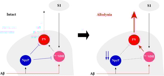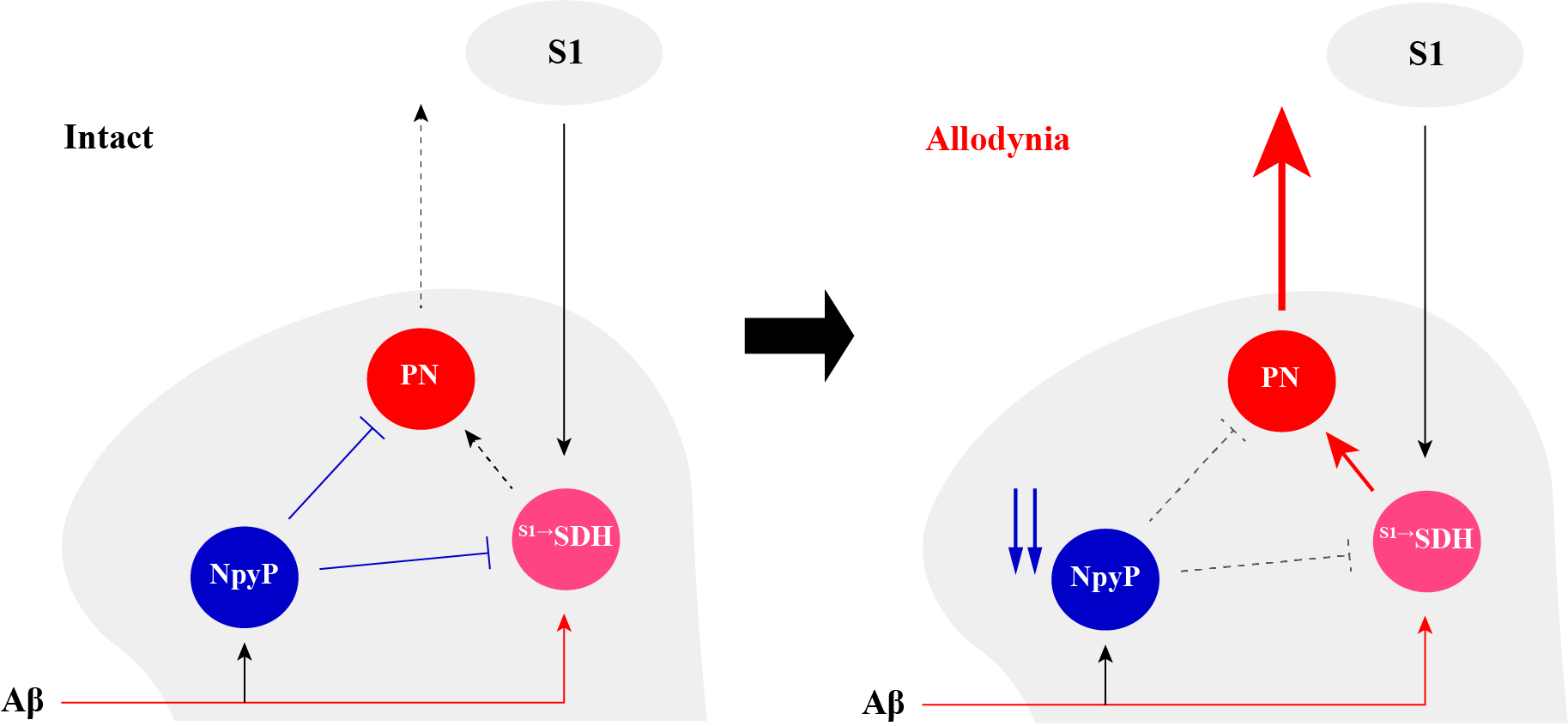 - Superficial SDH neurons receiving direct projections from S1 cortical neurons integrate excitatory inputs from Aβ fibers and inhibitory inputs from SDH interneurons; loss of this inhibition unmasks their excitatory influence on spinal circuits, leading to allodynia.