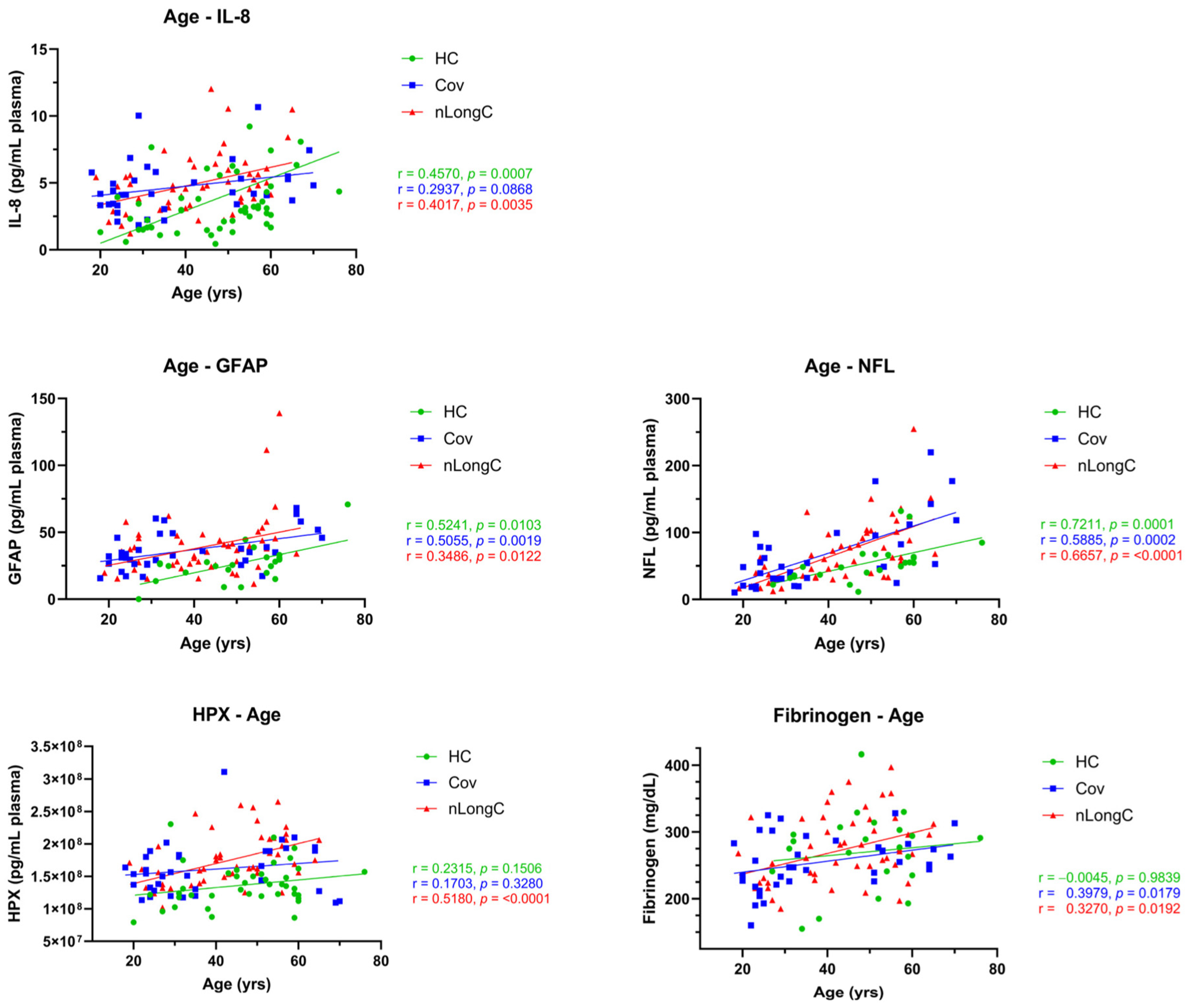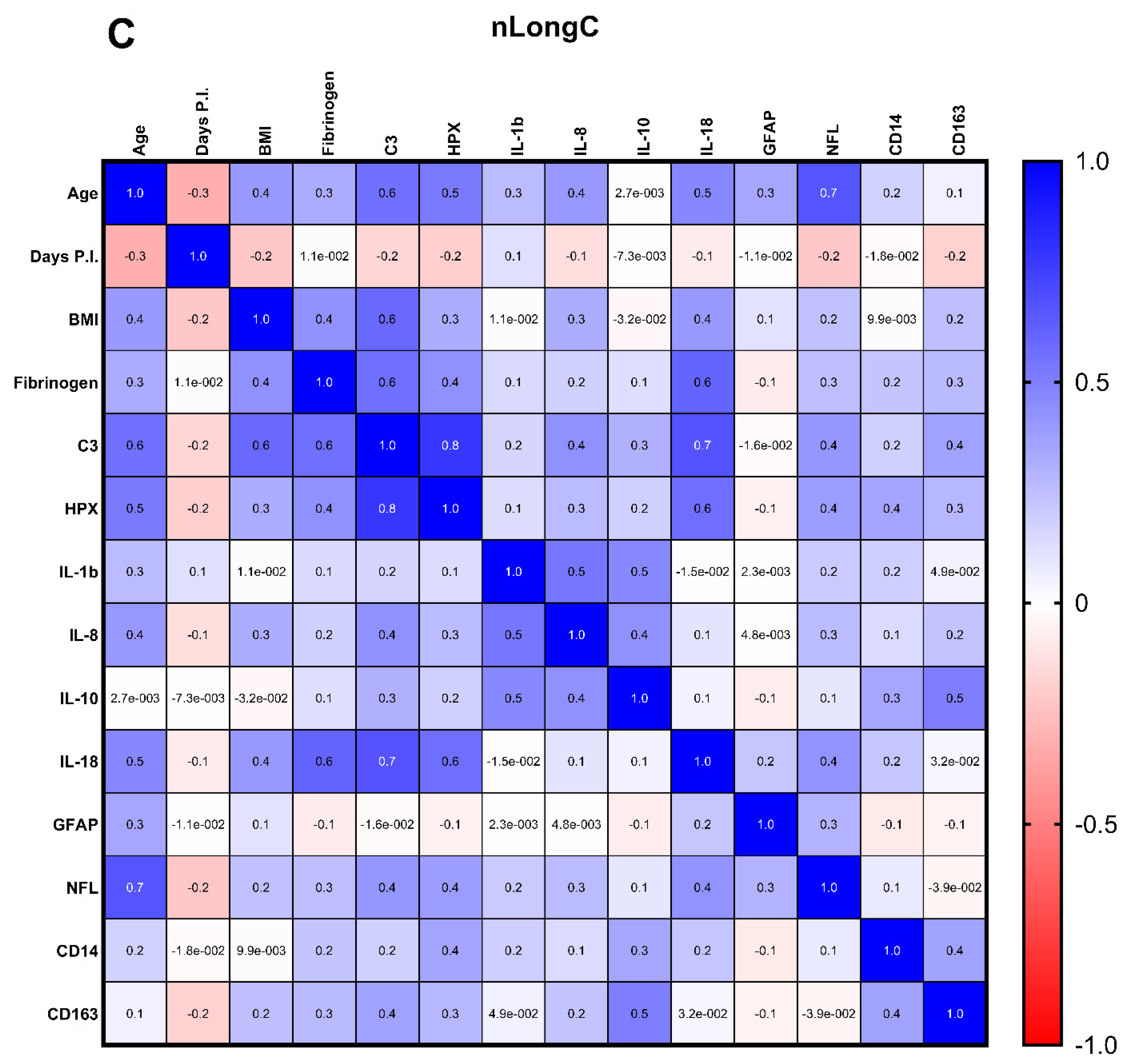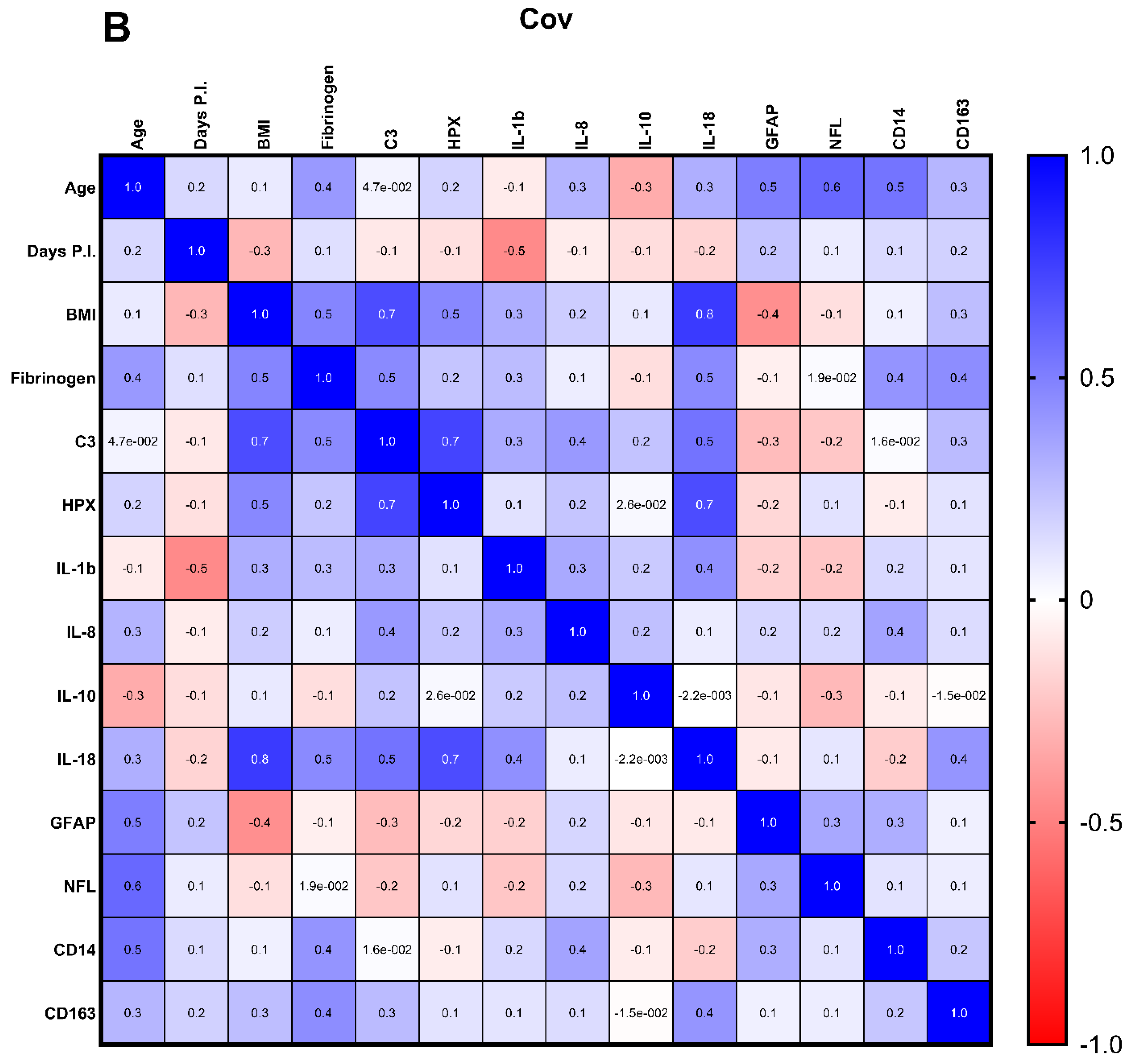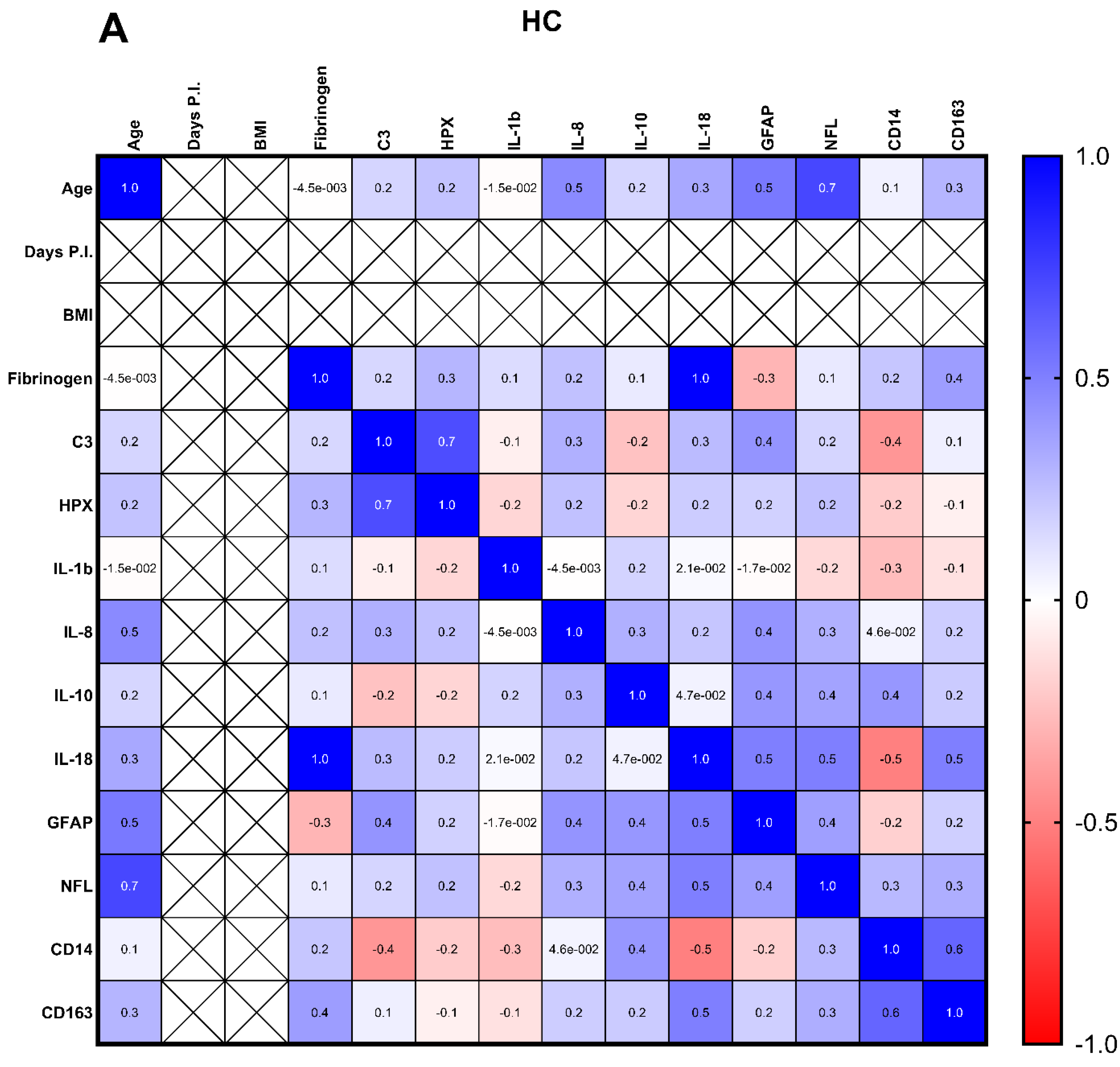 | Age | Days P.I. | BMI | Fibrinogen | C3 | HPX | IL-1β | IL-8 | IL-10 | IL-18 | GFAP | NFL | CD14 | CD163 | |