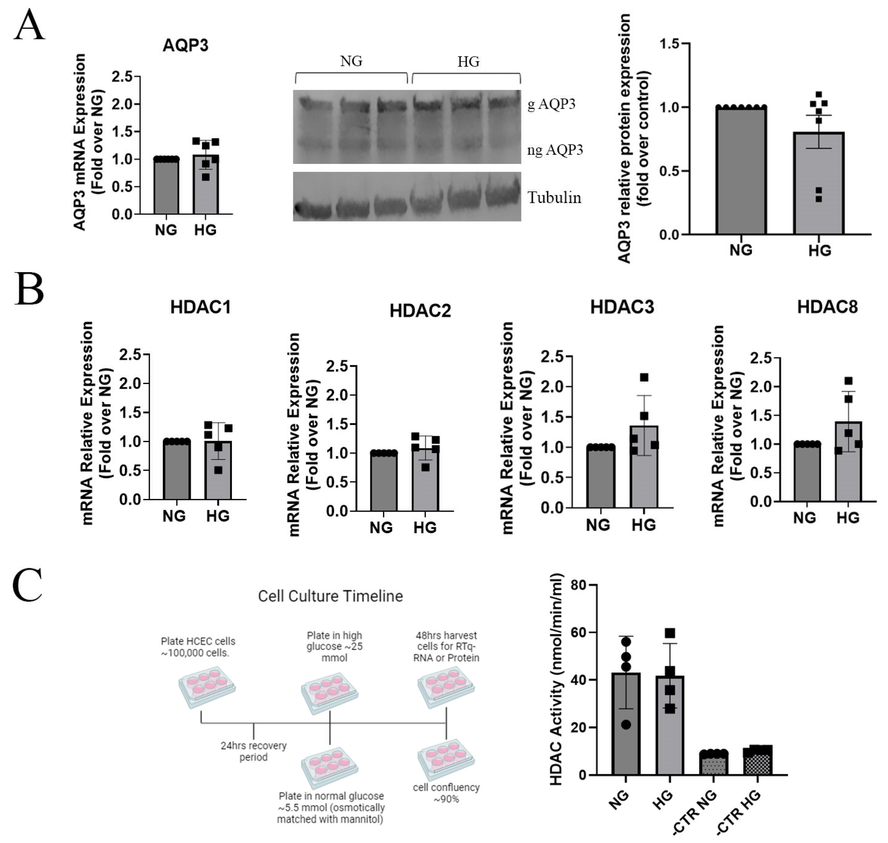 3.1. HDAC Inhibition Increased AQP3 Levels in HCECs Grown in Standard (Hyperglycemic) Conditions