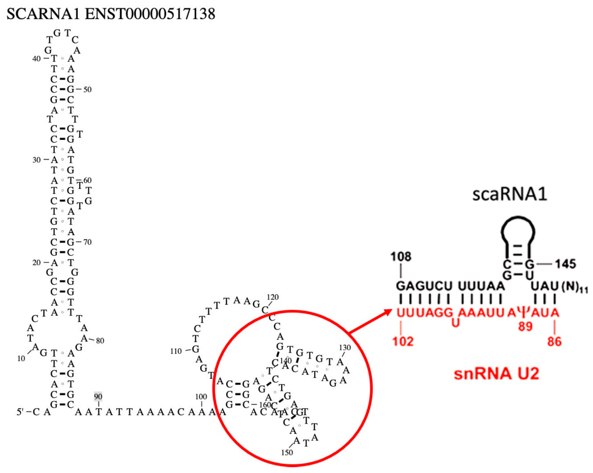 - Nagasawa, C.K.; Kibiryeva, N.; Marshall, J.; O’Brien, J.E., Jr.; Bittel, D.C. scaRNA1 Levels Alter Pseudouridylation in Spliceosomal RNA U2 Affecting Alternative mRNA Splicing and Embryonic Development. Pediatr. Cardiol. 2020, 41, 341–349. [Google Scholar] [CrossRef]