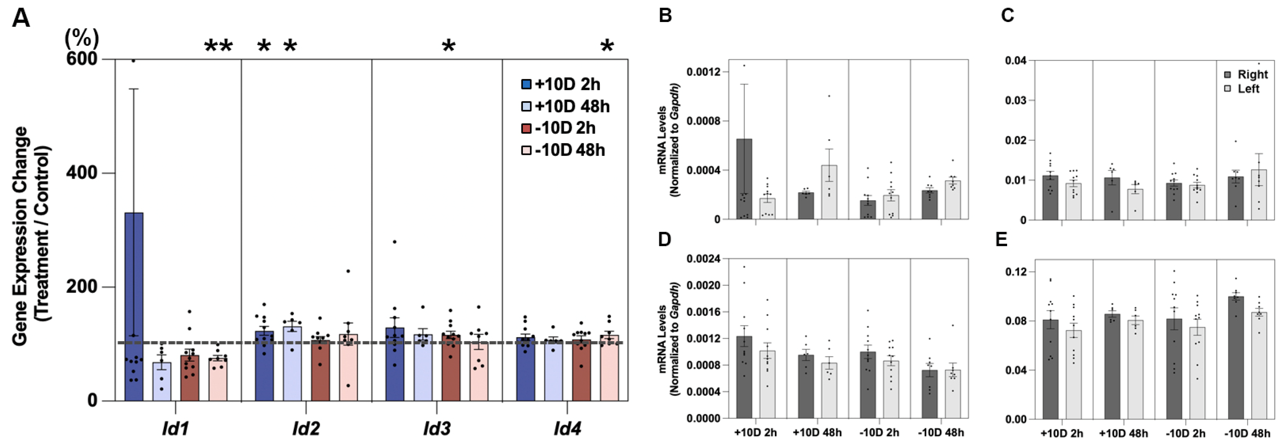 Figure 6. Choroidal Id1-4 gene expression changes after 2 or 48 h of +10 or −10 D lens wear shown in (A), expressed as ratios of values for treated eyes versus control eyes (%, n = 10 for all treatment groups). Choroidal mRNA levels, normalized to Gapdh, are also shown for treated and control eyes, and Id1, Id2, Id3, and Id4 ((BE), respectively). Note differences in Y-axis scales in individual panels, used to accommodate gene-dependent differences in expression levels. * p < 0.05, ** p < 0.01.