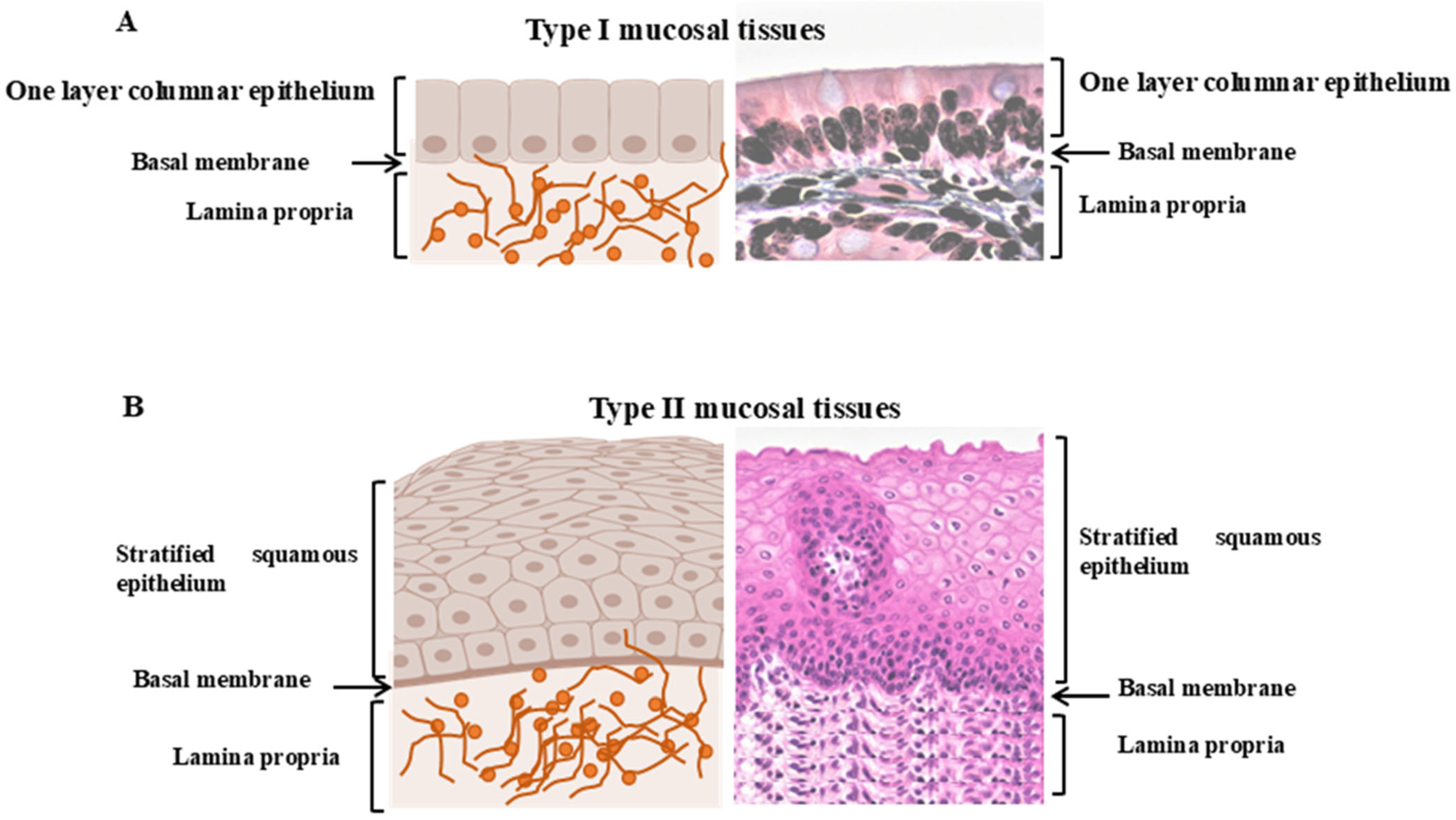 Figure 1. Structures of mucous membrane surfaces in the human body. (A) Type I mucosal tissues consist of an epithelial cell layer covered by a protective mucous layer maintained by cells such as goblet cells. This type of mucosal tissues lines the intestines, respiratory tract, and upper female reproductive tract. They act as a physical and chemical barrier, interface to the external environment and have unique immune components such as a mucous layer with embedded immune cells and the local production of secretory IgA (sIgA). (B) Type II mucosal tissue consists of stratified squamous epithelial layers and forms the mucosal surfaces of the mouth and lower female reproductive tract. They are characterized by specific immune cells and pathways that are essential for the activation of innate lymphoid cells type 2 and the induction of inflammatory responses by submucosal dendritic cells. Created on 20 November 2025 by BioRender.com.