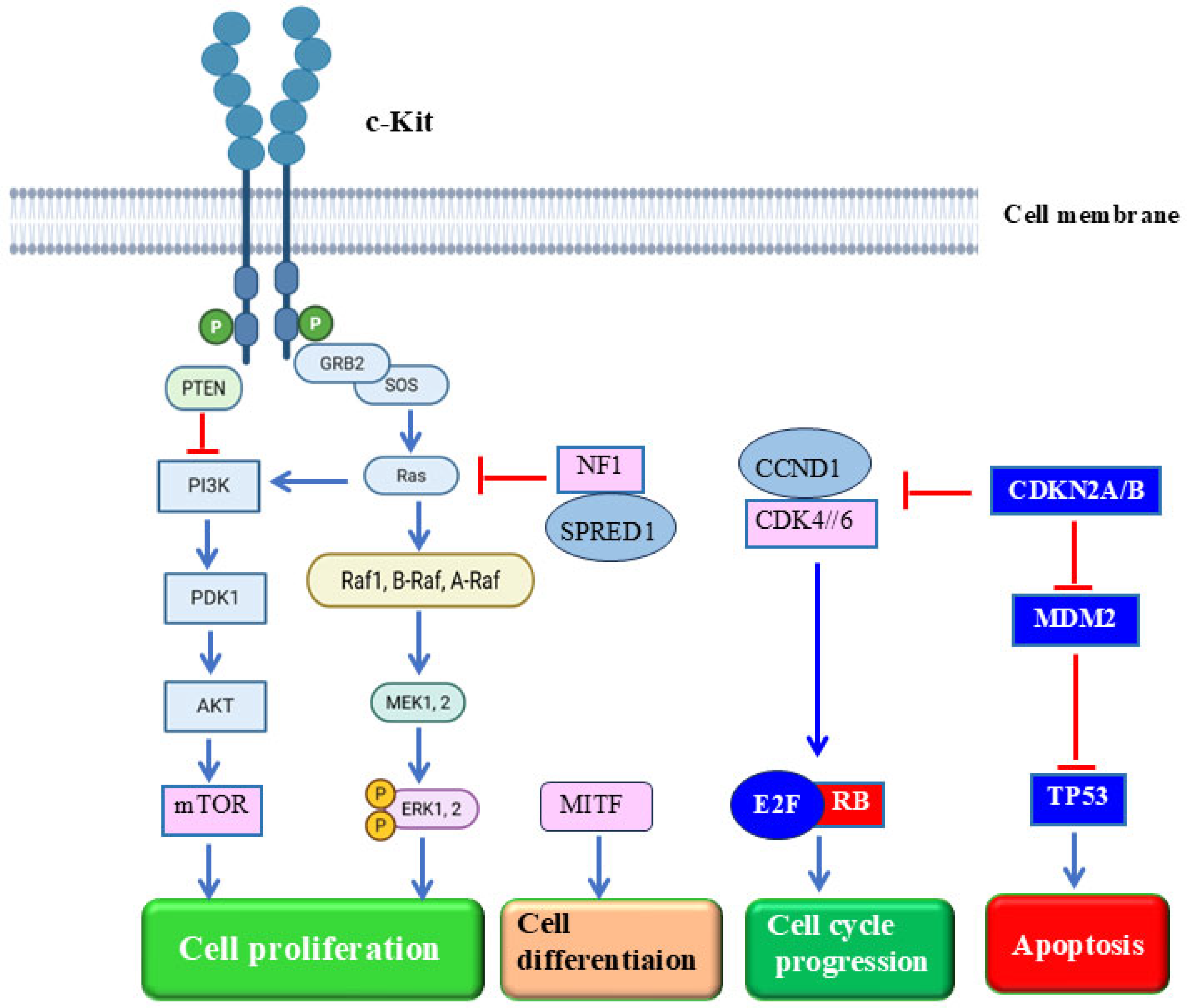 Figure 2. Main signaling pathways and their functional role in MM. BRAF: B-Raf proto-oncogene; CDK4/6: Cyclin-dependent kinase 4/6; CCND1: Cyclin D1; CDKN2A/B: Cyclin-dependent kinase inhibitor of kinase 2A/B; E2F: Transcription factor 2; ERK: Extracellular related kinase; KIT: receptor tyrosine kinase; MDM2: mouse double minute 2 p53 binding protein homolog; MITF, Microphthalmia-associated transcription factor; MEK:MAP kinase; mTOR: mammalian target of rapamycin; NF1: neurofibromin 1; NRAS: neuroblastoma RAS viral oncogene homolog; PI3K: Phosphatidylinositol 3 kinase; PTEN: Phosphatase and tensin homolog; RB1: retinoblastoma 1; SPRED1: sprout-related EVH1 domain containing protein 1; TP53: tumor suppressor protein. Created by BioRender.com.