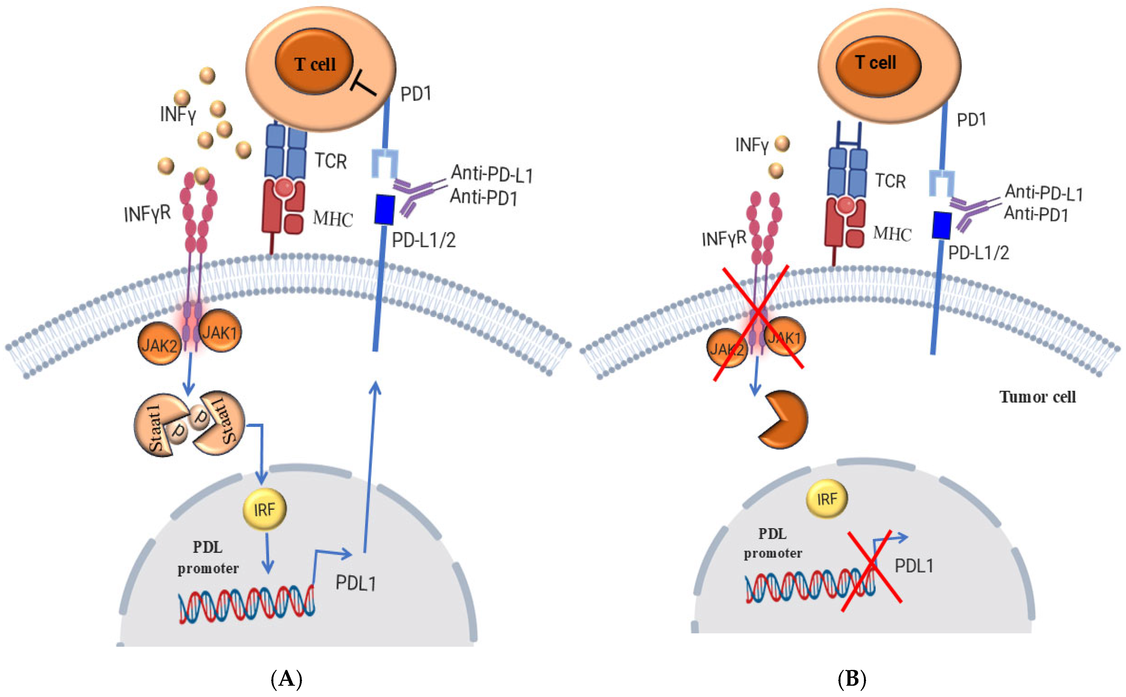 Figure 4. (A) An anti-tumor immune response is essential for effective blockade of immune checkpoints. Tumor-reactive T cells that recognize tumor neoantigens in MHC class I or class II-dependent interferon-γ (IFNγ). As a result, IFNγ enhances the activation of the IFNγ receptor (IFNγR), leading to JAK1/JAK2-dependent phosphorylation and dimerization of state 1, which in turn triggers the adaptive expression of programmed cell death ligand 1 (PD-L1) on the surface of tumor cells, which can negatively regulate the antitumor T cell response. (B) Tumor-specific T cells interact with MHC-antigens on the surface of tumor cells, leading to the release of IFNγ. Due to genetic deficiencies in IFNγ signaling in tumor cells, the IFNγ signal cannot be further transduced to enhance adaptive PD-L1 expression. As a result, blockade of the PD 1-PD-L1 immune checkpoint becomes ineffective in triggering an anti-tumor immune response. As, consequence, the tumor cells develop resistance to immunotherapy. Created by BioRender.com.