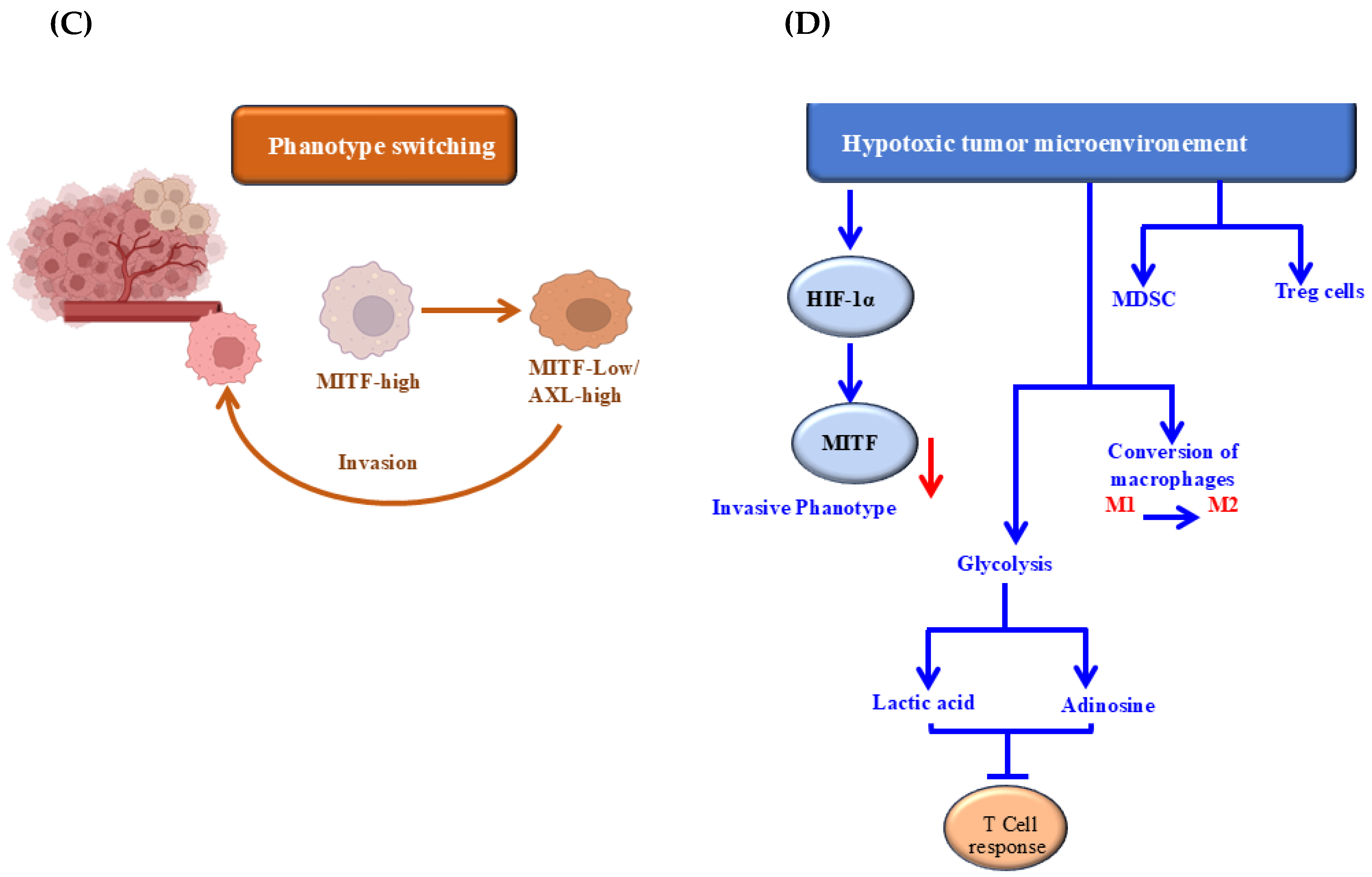 Figure 5. Extrinsic mechanisms involved in the regulation of tumor resistance to immune checkpoint blockade. (A) Immune-suppressive cell components including regulatory T cells (Treg), tumor-associated macrophages (TAMs), regulatory dendritic cells (DC), and myeloid-derived suppressor cells (MDSC). (B) Inhibitory receptors (PD L1, LAG-3, TIM-3, and VISTA) and their biological consequences. (C) Mechanisms of phenotype switching. (D) Hypoxic tumor microenvironment-mediated effects. Abbreviations: LAG-3, lymphocyte-activation gene 3; PDL-1, programmed death ligand 1; TIM-3, T-cell immunoglobulin and mucin domain 3; VISTA, V-domain I g suppressor of T cell activation; HIF-1α, hypoxia-inducible factor 1-alpha; MITF, microphthalmia-associated transcription factor. Created by BioRender.com.