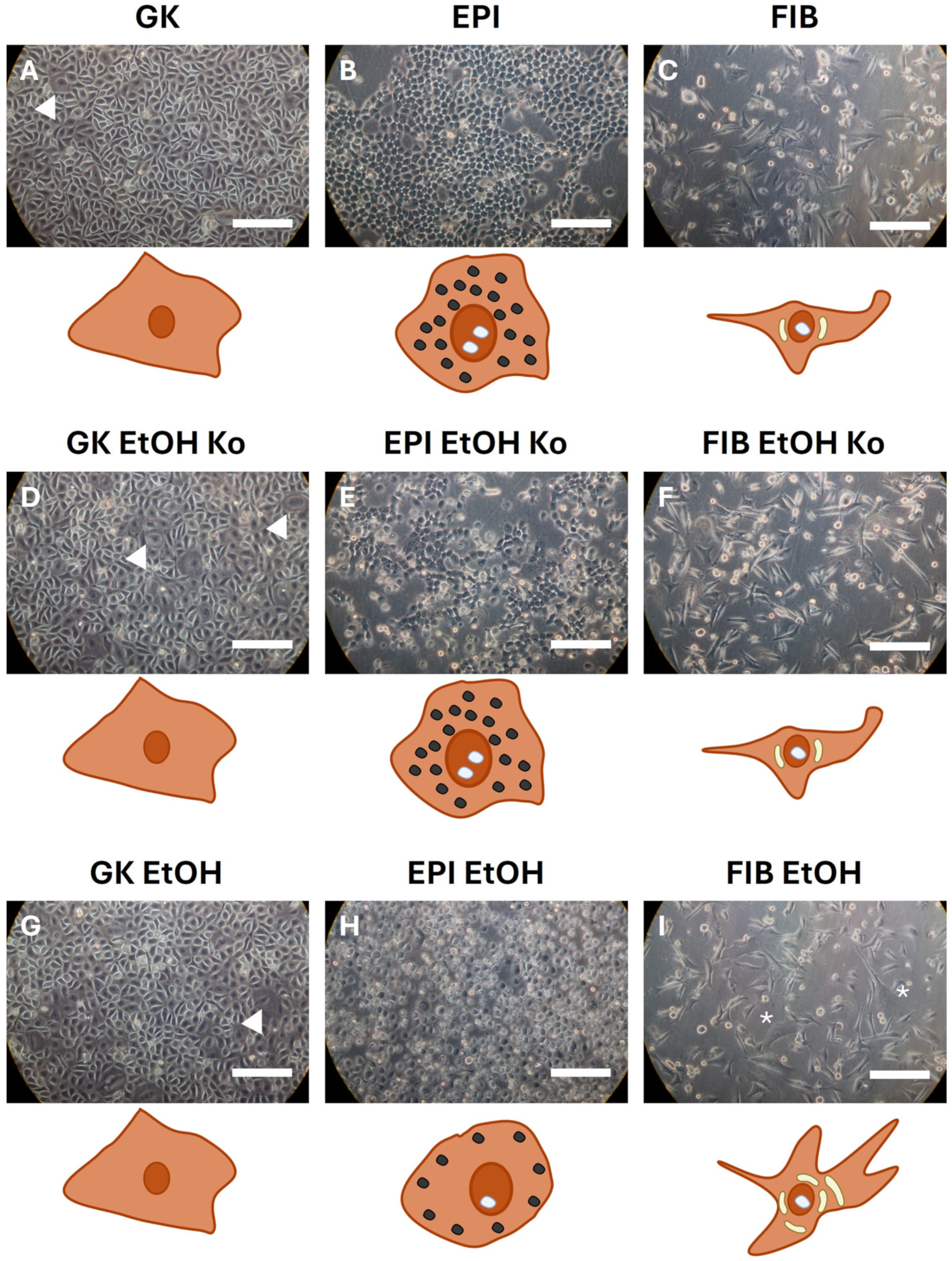 3.1. EtOH and EMT Cocktail Treatment-Induced Distinct Morphological Changes in Gingival Keratinocytes