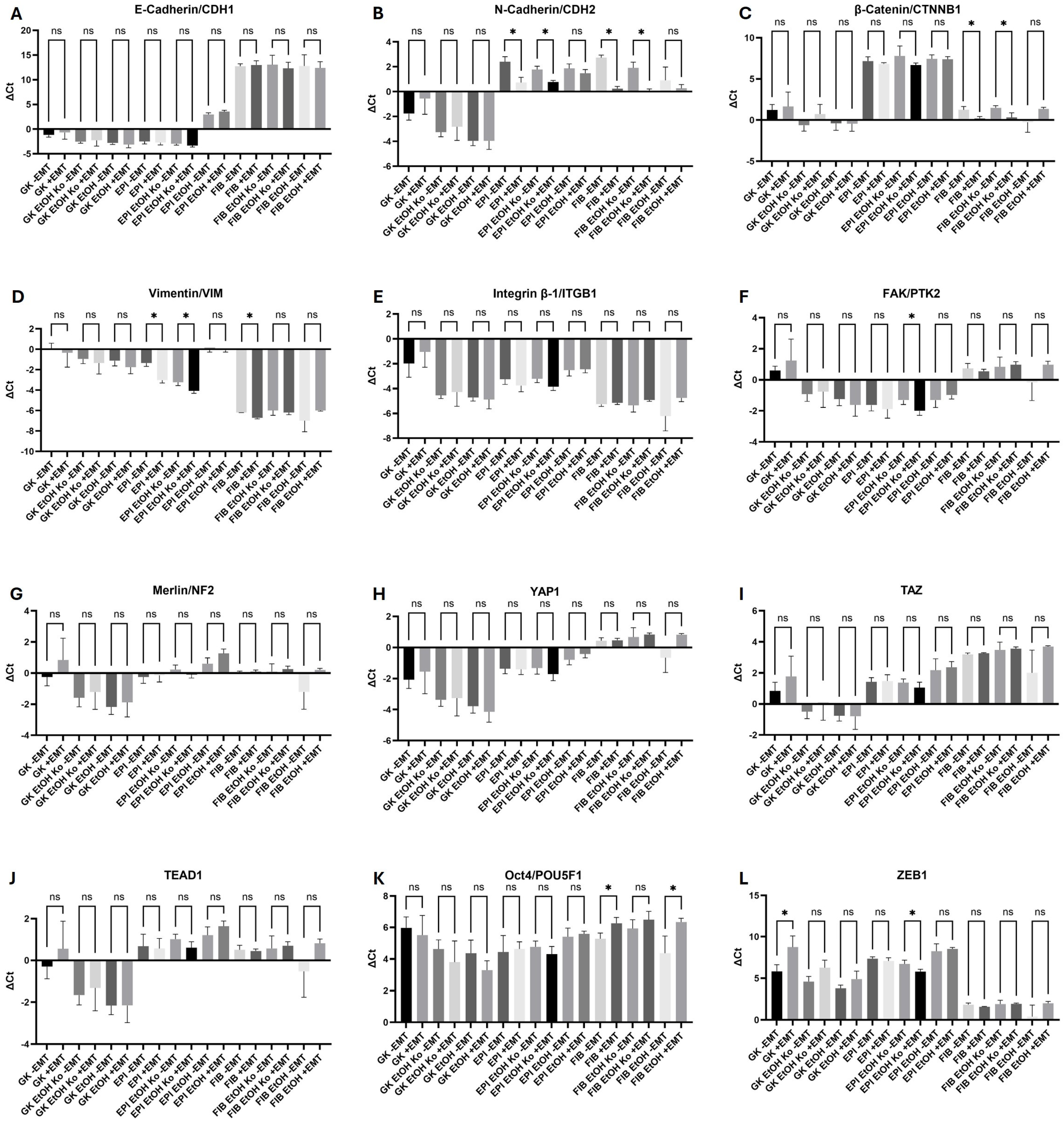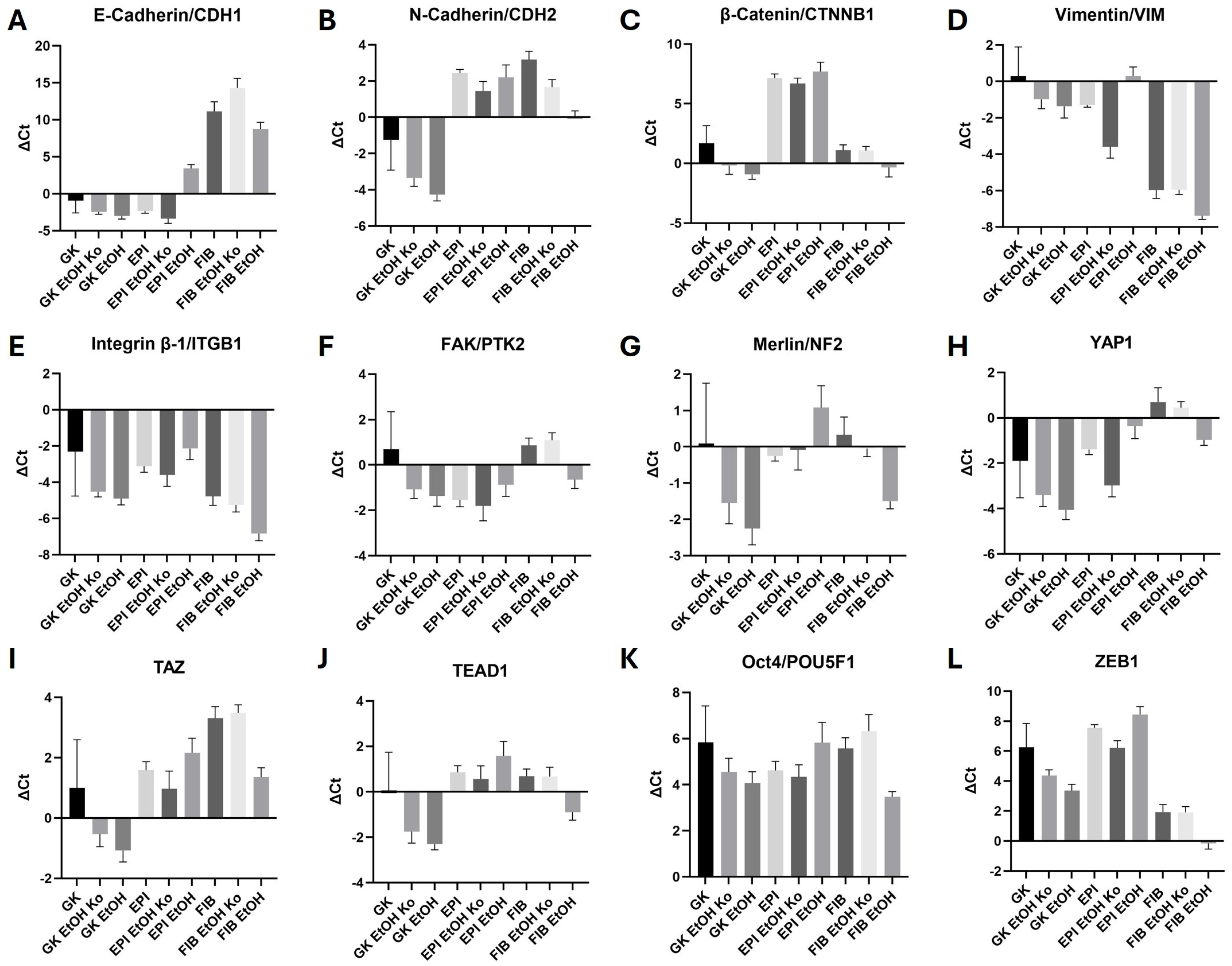 3.2. EtOH Treatment Modulated Adhesion- and EMT-Associated Gene Expression in GK, EPI and FIB Cells