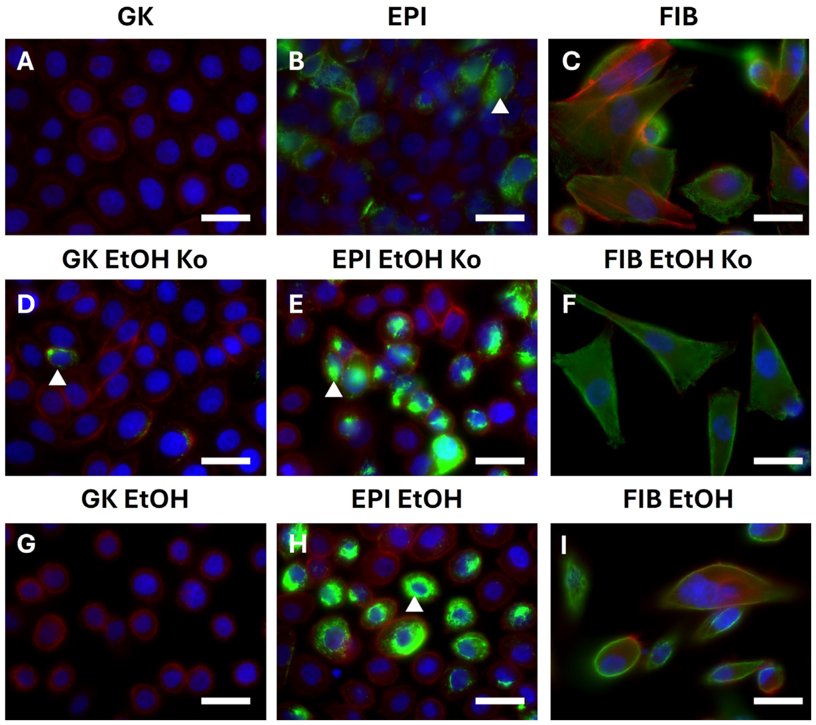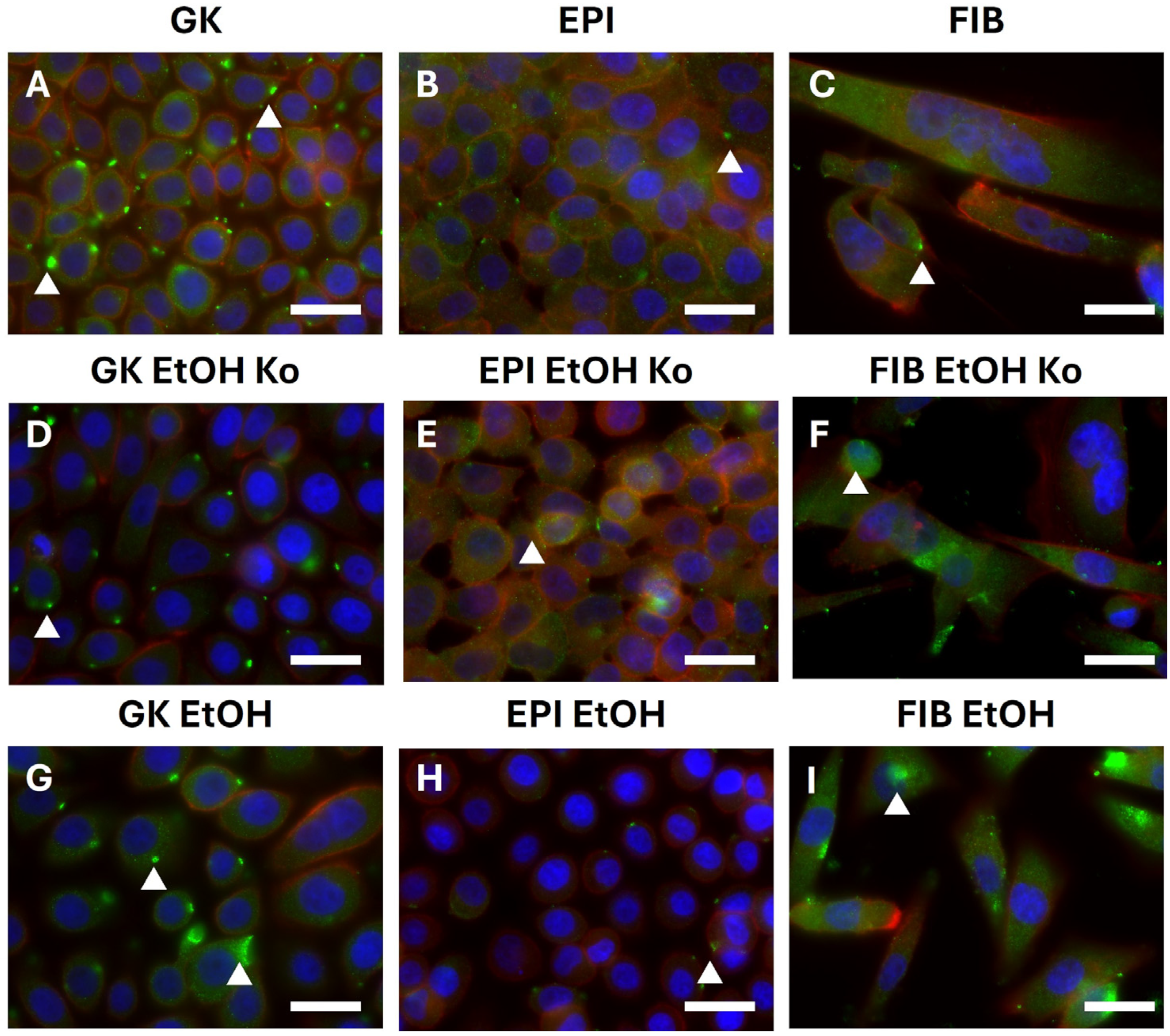 3.4. EtOH Treatment Altered the Abundance of Mechanobiologically Relevant Marker Proteins in GK, EPI and FIB Cells