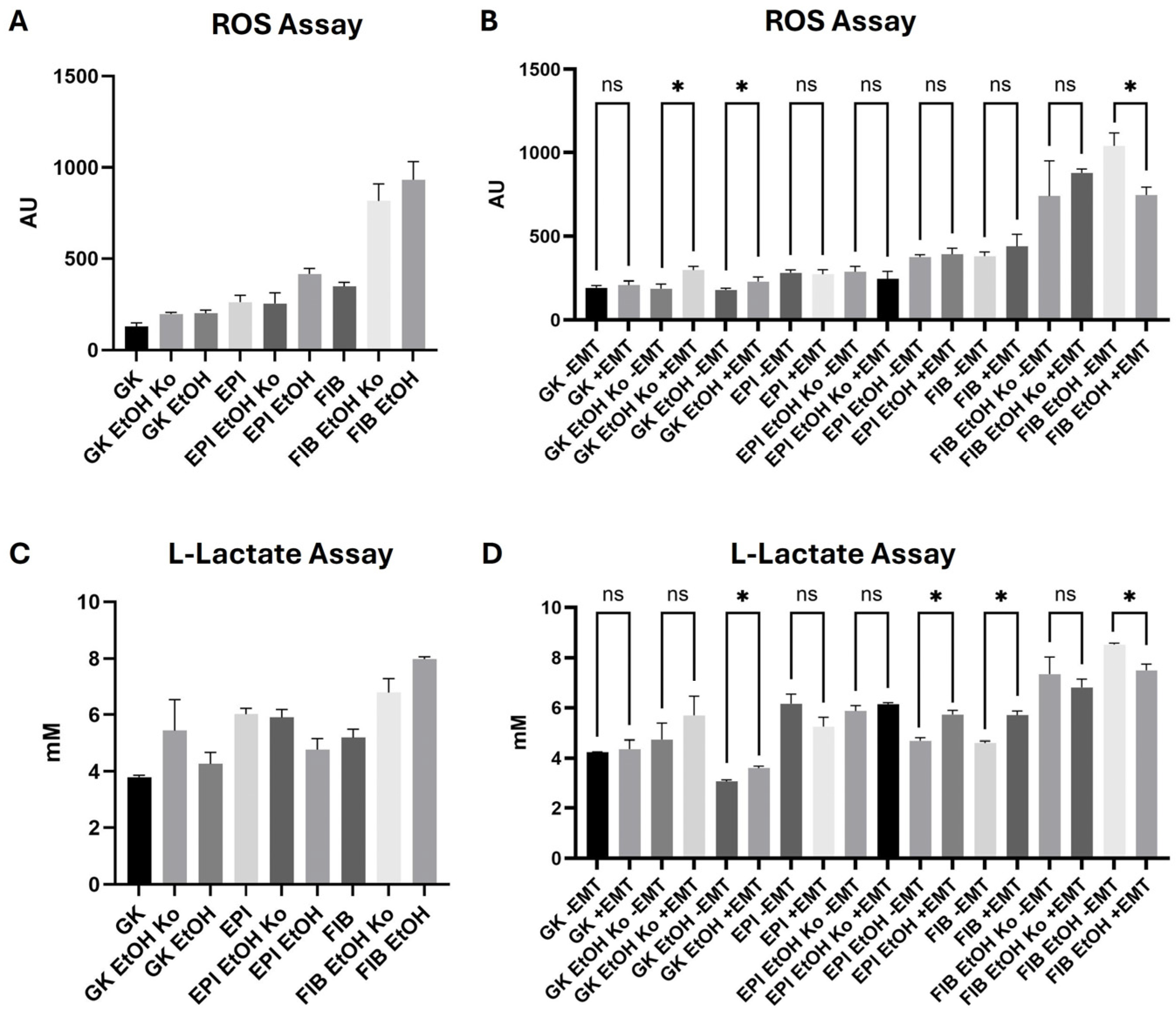 3.8. Cellular L-Lactate Production Was Differentially Modulated by EtOH and “+EMT” Treatment