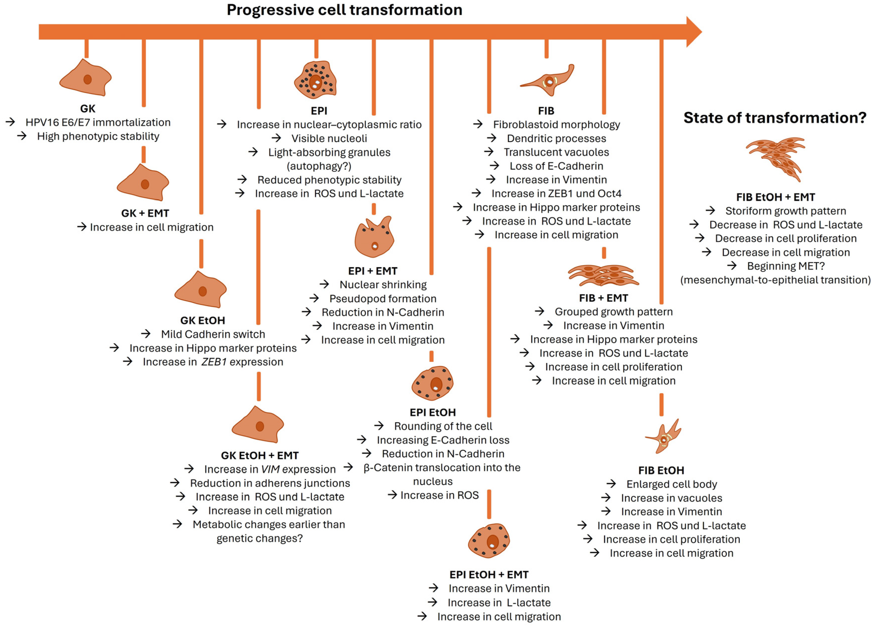 - Advanced transformation stages (especially FIB EtOH) exhibit metabolic heterogeneity and potentially even partial MET, reflecting the dynamic equilibrium of epithelial and mesenchymal cell differentiation.