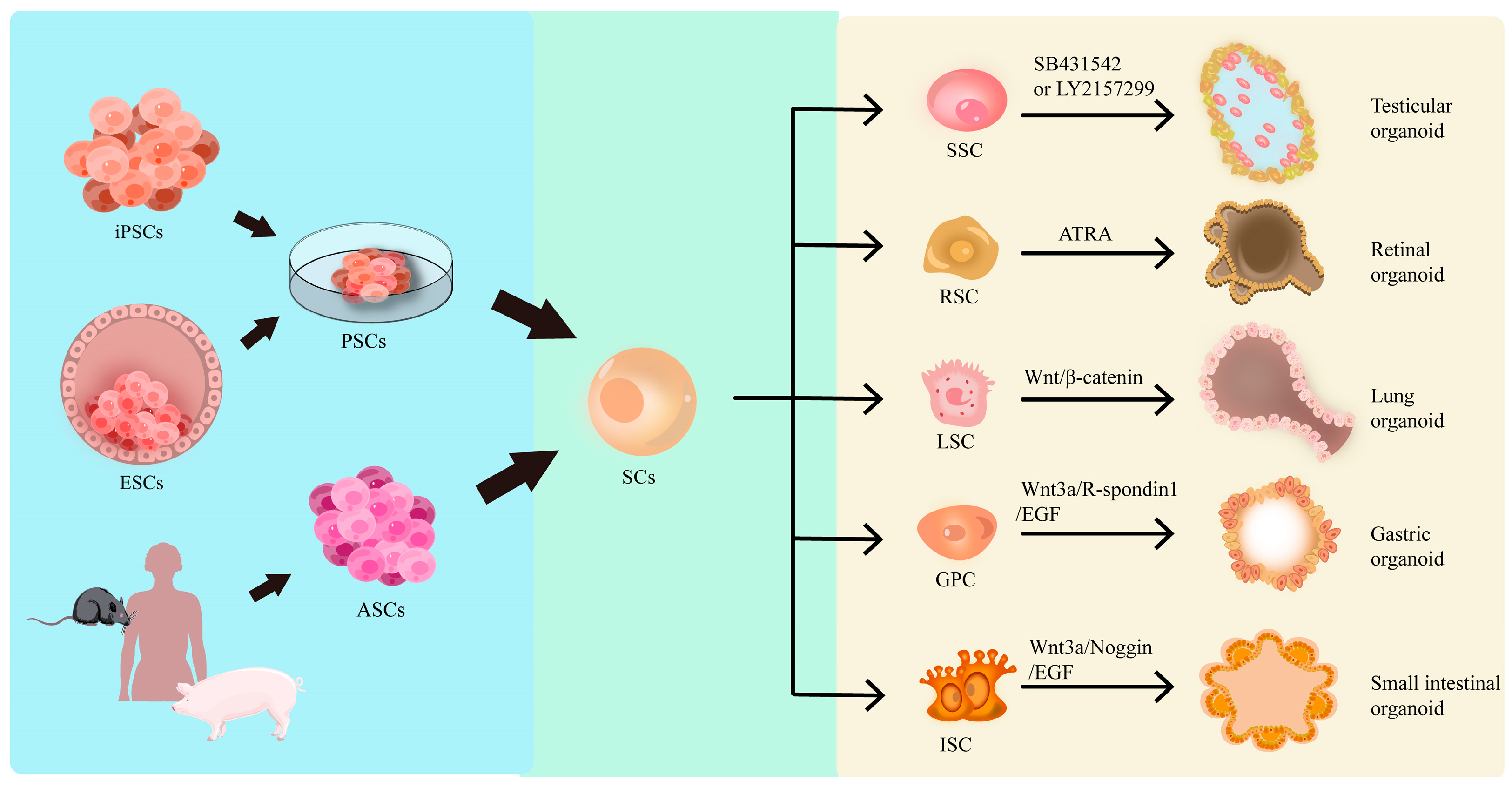 | ASCOs | ASCs | Matrigel/ECM/synthetic hydrogel | Rapidly established, preserving specific structure/function | Lineage differentiation potential is limited | Adult disease modeling, regenerative medicine | [73] |