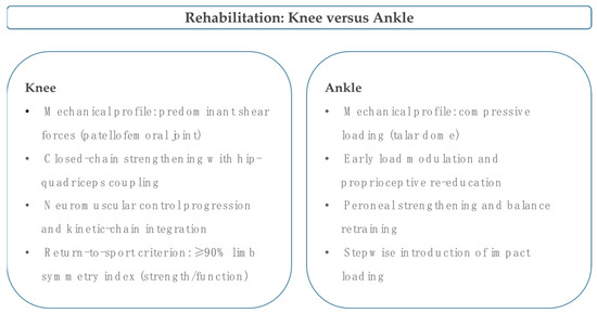 Patellofemoral shear forces dominate the knee profile and therefore prioritise closed-chain quadriceps-hip strengthening, progression of neuromuscular control, and kinetic-chain integration, with return to sport guided by a limb symmetry index ≥90% for strength and function. The ankle profile is characterised by predominantly compressive loading across the talar dome, requiring early load modulation, proprioceptive re-education, peroneal strengthening and a stepwise introduction of impact loading.