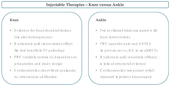 Injectables are adjuncts to a rehabilitation-led pathway, not substitutes; indications and expectations must match joint biology and the distinct loading of the knee and ankle [,,,]. In a two-year, double-blind, randomised trial of 140 patients with symptomatic knee OA, intra-articular triamcinolone given every three months caused greater cartilage volume loss than saline (−0.21 mm vs. −0.10 mm; between-group difference −0.11 mm), without any additional improvement in pain scores []. These findings indicate that repeated corticosteroid injections may accelerate structural deterioration without clinical benefit and should therefore be avoided in non-arthritic focal cartilage defects, where preservation of native tissue remains the primary goal []. A single shot may unblock the rehab during florid synovitis. Still, it should not be framed as disease-modifying [,,]. Hyaluronic acid sits in the middle; it can modulate viscosity and nociception [,,,,]. In a randomised controlled trial involving 86 patients with patellofemoral pain who had previously failed conservative management, Hart et al. [] compared a single 6 mL intra-articular hyaluronic acid injection with a sham procedure, with all participants following a structured home exercise programme. Both groups showed significant improvement in pain and functional scores at six months, but there was no difference between treatments in any outcome measure, including pain, KOOS, or Kujala score []. These findings indicate that hyaluronan provides no additional benefit over exercise alone and should therefore be reserved, if used at all, for short, clearly defined adjunctive courses within supervised rehabilitation []. Platelet-rich plasma offers the clearest human signal in the ankle. A randomised trial on talar osteochondral lesions, including about thirty participants, showed that three weekly leukocyte poor injections were superior to hyaluronan at twenty-eight weeks for AOFAS and pain with minimal adverse events. A pragmatic approach is two or three injections of leukocyte poor PRP after a high-quality programme has plateaued. The knee focal literature is thinner and often contaminated by OA, so consider PRP only in carefully selected non-arthritic phenotypes, with expectations set on symptomatic and functional gains rather than structure [,]. Bone marrow aspirate concentrate and mesenchymal stromal cell injectables remain investigational in purely non-operative focal care; most human series are used as surgical adjuncts or in OA cohorts. No randomised evidence supports the efficacy of injection only in knee or ankle focal defects. These products should be tested in trials with transparent cell characterisation and safety monitoring; regeneration claims should be made frankly [,,,,,,]. Cell-free biologics, such as exosomes and stand-alone hydrogels, lack clinical evidence for focal lesions and are not routinely used; timing is crucial. Any injection should open a window to progress load and skill within two to six weeks; otherwise, palliation is mistaken for recovery, a common and unhelpful progression. A practical overview of injectable options for the knee and ankle is provided in Figure 2.