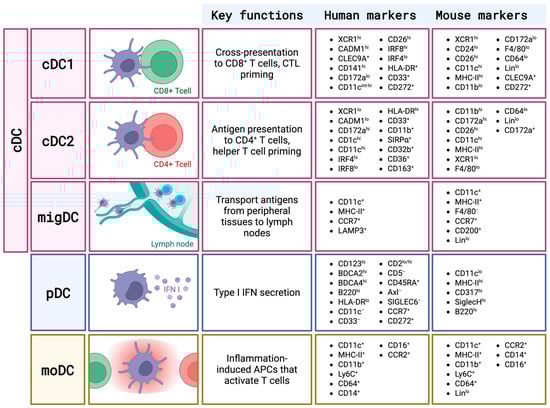 DC subsets and their key markers and functions. APC, antigen-presenting cell; cDC, conventional dendritic cells; CTL, cytotoxic T lymphocyte; IFN, interferon; migDC, migratory DC; moDC, monocyte-derived DC; pDC, plasmacytoid DC. Created in BioRender. Niedzielska, A. (2025) https://BioRender.com/56nrpqh (accessed on 26 November 2025) https://BioRender.com/56nrpqh.