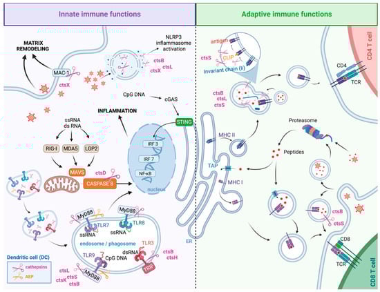 Role of cathepsins in innate and adaptive immune functions of DC during viral infections. Cathepsins regulate multiple aspects of DC biology in response to viral infection. In endosomes, cathepsins activate Toll-like receptors (TLR3, TLR7, TLR8, and TLR9) by proteolytic cleavage, allowing DCs to recognize viral nucleic acids and trigger signaling through MyD88 or TRIF. These pathways activate transcription factors such as IRF3, IRF7, and NF-κB, leading to the production of inflammatory and antiviral molecules. Within endosomal and phagosomal compartments, cathepsins together with AEP break down internalized viral proteins into peptides that are loaded onto MHC class II molecules and presented to CD4+ T cells. Cathepsins also process the invariant chain (Ii) and remove the CLIP peptide from MHC II, ensuring efficient antigen loading and T-cell priming. In the cytosol, viral DNA detection by cGAS activates STING supports antigen cross-presentation on MHC I molecules to CD8+ T cells. Cathepsins also contribute to DC maturation, extracellular matrix remodeling, and cytokine production, all of which are crucial for DC migration and the activation of adaptive immune responses during viral infection. AEP, asparagine endopeptidase; cGAS, cyclic GMP–AMP synthase; CLIP, class II-associated invariant chain peptide; DC, dendritic cell; dsRNA, double-stranded RNA; ER, endoplasmic reticulum; IRF, interferon regulatory factor; LGP2, laboratory of genetics and physiology 2; MAC-1, macrophage-1 antigen; MAVS, mitochondrial antiviral-signaling protein; MDA5, melanoma differentiation-associated protein 5; MHC, major histocompatibility complex; MyD88, myeloid differentiation primary response 88; NF-κB, nuclear factor kappa-light-chain-enhancer of activated B cells; ssRNA, single-stranded RNA; STING, stimulator of interferon genes; TAP, transporter associated with antigen processing; TCR, T cell receptor; TLR, Toll-like receptor; TRIF, TIR-domain-containing adapter-inducing interferon-β. Created in BioRender. Niedzielska, A. (2025) https://BioRender.com/jyawytg (accessed on 16 November 2025).