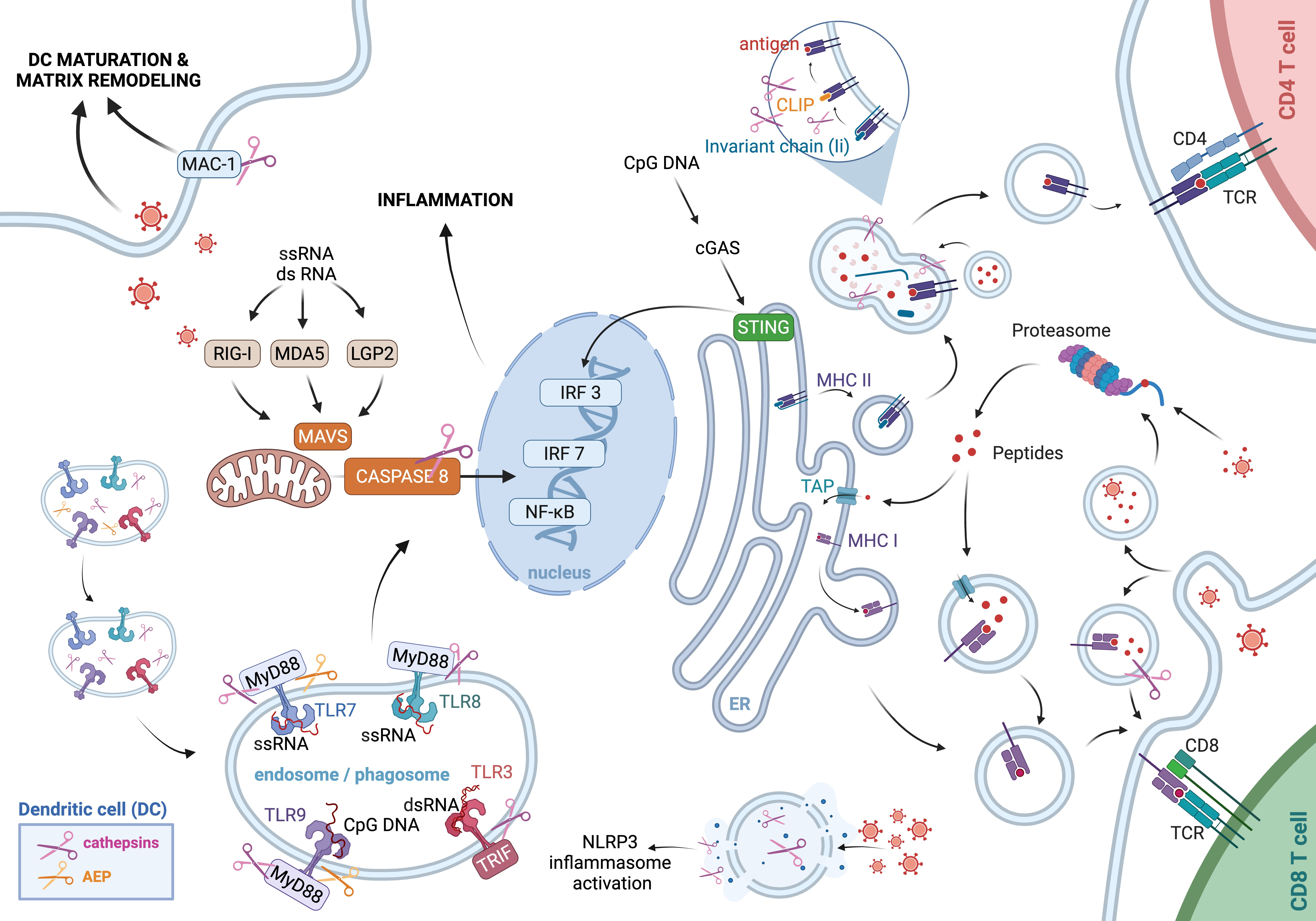 Figure 2. Role of cathepsins in innate and adaptive immune functions of DC during viral infections. Cathepsins regulate multiple aspects of DC biology in response to viral infection. In endosomes, cathepsins activate Toll-like receptors (TLR3, TLR7, TLR8, and TLR9) by proteolytic cleavage, allowing DCs to recognize viral nucleic acids and trigger signaling through MyD88 or TRIF. These pathways activate transcription factors such as IRF3, IRF7, and NF-κB, leading to the production of inflammatory and antiviral molecules. Within endosomal and phagosomal compartments, cathepsins together with AEP break down internalized viral proteins into peptides that are loaded onto MHC class II molecules and presented to CD4+ T cells. Cathepsins also process the invariant chain (Ii) and remove the CLIP peptide from MHC II, ensuring efficient antigen loading and T-cell priming. In the cytosol, viral DNA detection by cGAS activates STING supports antigen cross-presentation on MHC I molecules to CD8+ T cells. Cathepsins also contribute to DC maturation, extracellular matrix remodeling, and cytokine production, all of which are crucial for DC migration and the activation of adaptive immune responses during viral infection. AEP, asparagine endopeptidase; cGAS, cyclic GMP–AMP synthase; CLIP, class II-associated invariant chain peptide; DC, dendritic cell; dsRNA, double-stranded RNA; ER, endoplasmic reticulum; IRF, interferon regulatory factor; LGP2, laboratory of genetics and physiology 2; MAC-1, macrophage-1 antigen; MAVS, mitochondrial antiviral-signaling protein; MDA5, melanoma differentiation-associated protein 5; MHC, major histocompatibility complex; MyD88, myeloid differentiation primary response 88; NF-κB, nuclear factor kappa-light-chain-enhancer of activated B cells; ssRNA, single-stranded RNA; STING, stimulator of interferon genes; TAP, transporter associated with antigen processing; TCR, T cell receptor; TLR, Toll-like receptor; TRIF, TIR-domain-containing adapter-inducing interferon-β. Created in BioRender. Niedzielska, A. (2025) https://BioRender.com/jyawytg (accessed on 16 November 2025).
