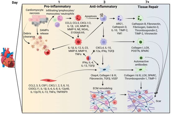 The timeline for the cardiac response to MI is summarized in Table 1 [,,,]. MI triggers the release of damage-associated molecular patterns (DAMPs) such as High-Mobility Group Box 1 (HMGB1), S100A8/A9, and mitochondrial DNA from necrotic cardiomyocytes, which activate pattern recognition receptors on resident immune cells and fibroblasts [,,]. This leads to the secretion of pro-inflammatory cytokines and chemokines, complement activation, and increased vascular permeability, facilitating leukocyte infiltration [,,].