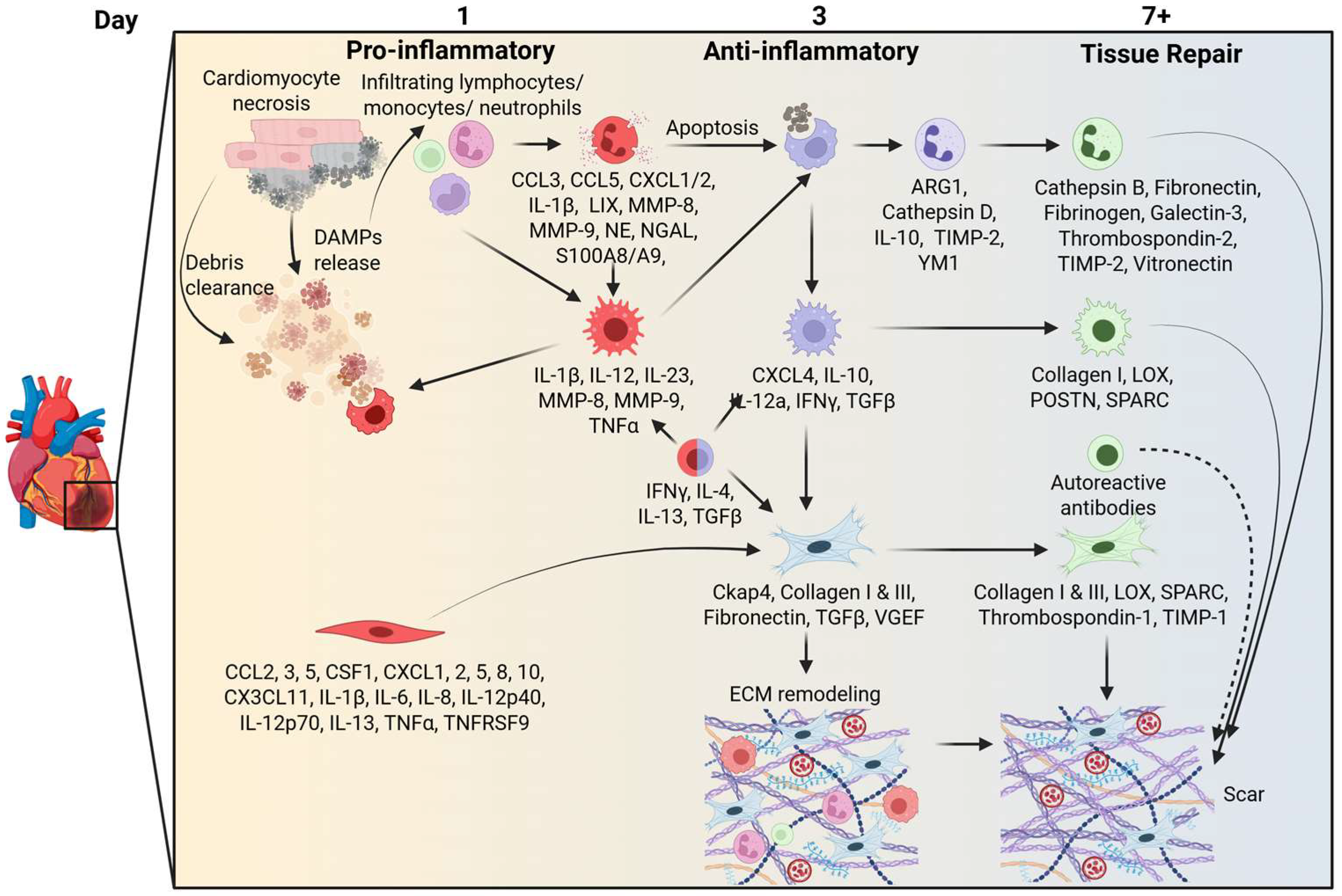 Figure 1. Time course of responses to myocardial infarction. The diagram delineates the temporal cascade of events that occur in response to myocardial infarction (MI), beginning with cardiomyocyte necrosis and damage-associated molecular pattern (DAMP)-mediated activation of the immune response. The pro-inflammatory phase at MI day 1 is characterized by infiltration of lymphocytes, monocytes/macrophages, and neutrophils, along with secretion of cytokines (e.g., interleukin (IL)-1β, tumor necrosis factor (Tnf)-α) and matrix metalloproteinases (MMPs). By day 3, anti-inflammatory mediators (e.g., IL-10 and transforming growth factor (Tgf)-β) and reparative macrophages promote apoptosis and extracellular matrix remodeling, transitioning to a reparative phase that begins about 7 days after MI and is marked by fibroblast activation, collagen deposition, and scar formation.