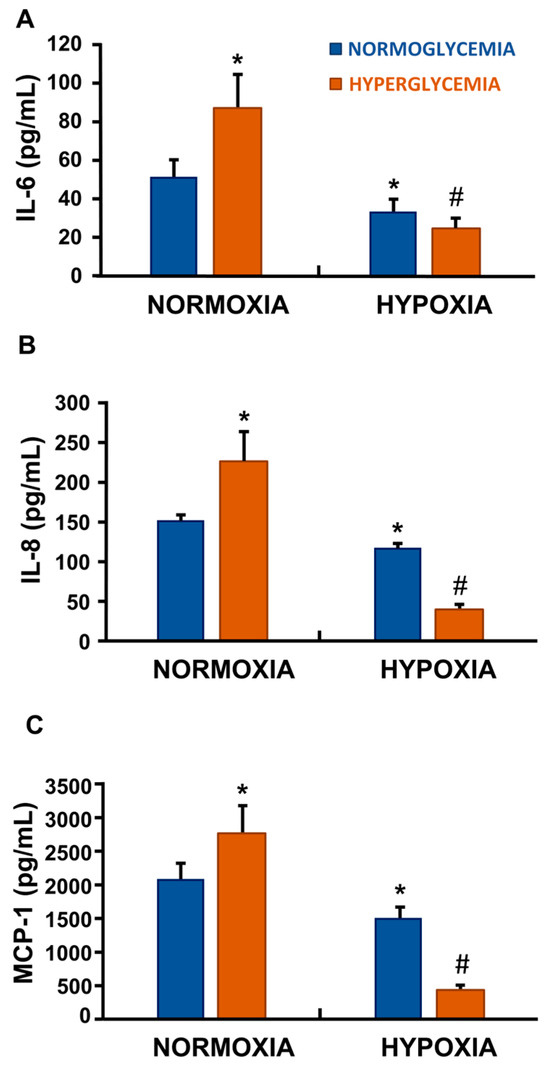 Pro-inflammatory SASP mediates the paracrine effects of senescent cells on their surrounding tissue microenvironment. In our model, elevated glucose levels alone were sufficient to induce a clear senescent phenotype in ECs (p < 0.05 vs. normoxic, normoglycemic control) (Figure 2A–C). Unexpectedly, however, hypoxia—either alone or in combination with high glucose—attenuated the pro-inflammatory secretory phenotype, resulting in a marked reduction in the cytokines IL-6 and IL-8, as well as of the chemokine MCP-1 (Figure 2A–C).
