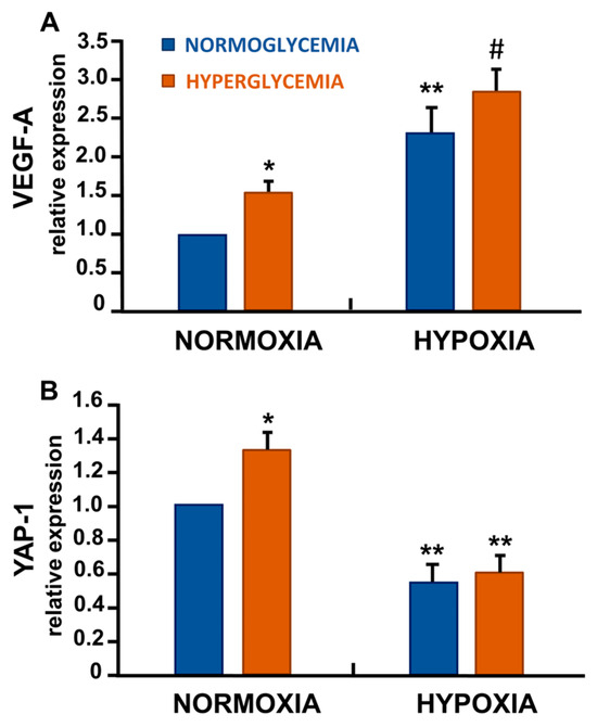 As expected, high glucose and hypoxia, either alone (p < 0.05 and p < 0.01, respectively) or in combination (p < 0.001), significantly induced transcriptional upregulation of the angiogenic factor VEGF-A (Figure 3A). Furthermore, we analysed the YAP-1 levels, a key regulator of the Hippo signalling pathway, which is involved in cell growth and survival. Notably, YAP-1 mRNA expression was significantly reduced under hypoxia-induced senescence (p < 0.01) (Figure 3B).