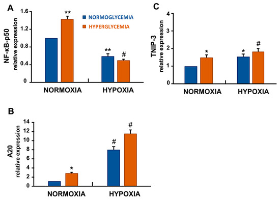 Hypoxia and combined hypoxia with high glucose downregulated NF-κB-p50 expression while upregulating A20 and TNIP-3, two negative regulators of the NF-κB pathway. High glucose increased NF-κB-p50 mRNA expression, while hypoxia, alone or in combination with high glucose, showed a marked reduction in NF-κB-p50 mRNA levels (A). In contrast, A20 and TNIP-3 mRNA expression (B,C) increased significantly, with the strongest induction observed with both stressors. Data represent mean ± SD of three independent experiments, each performed in duplicate [* p < 0.05, ** p < 0.01 and # p < 0.001 compared with control (normoxia with 5.5 mM glucose)].