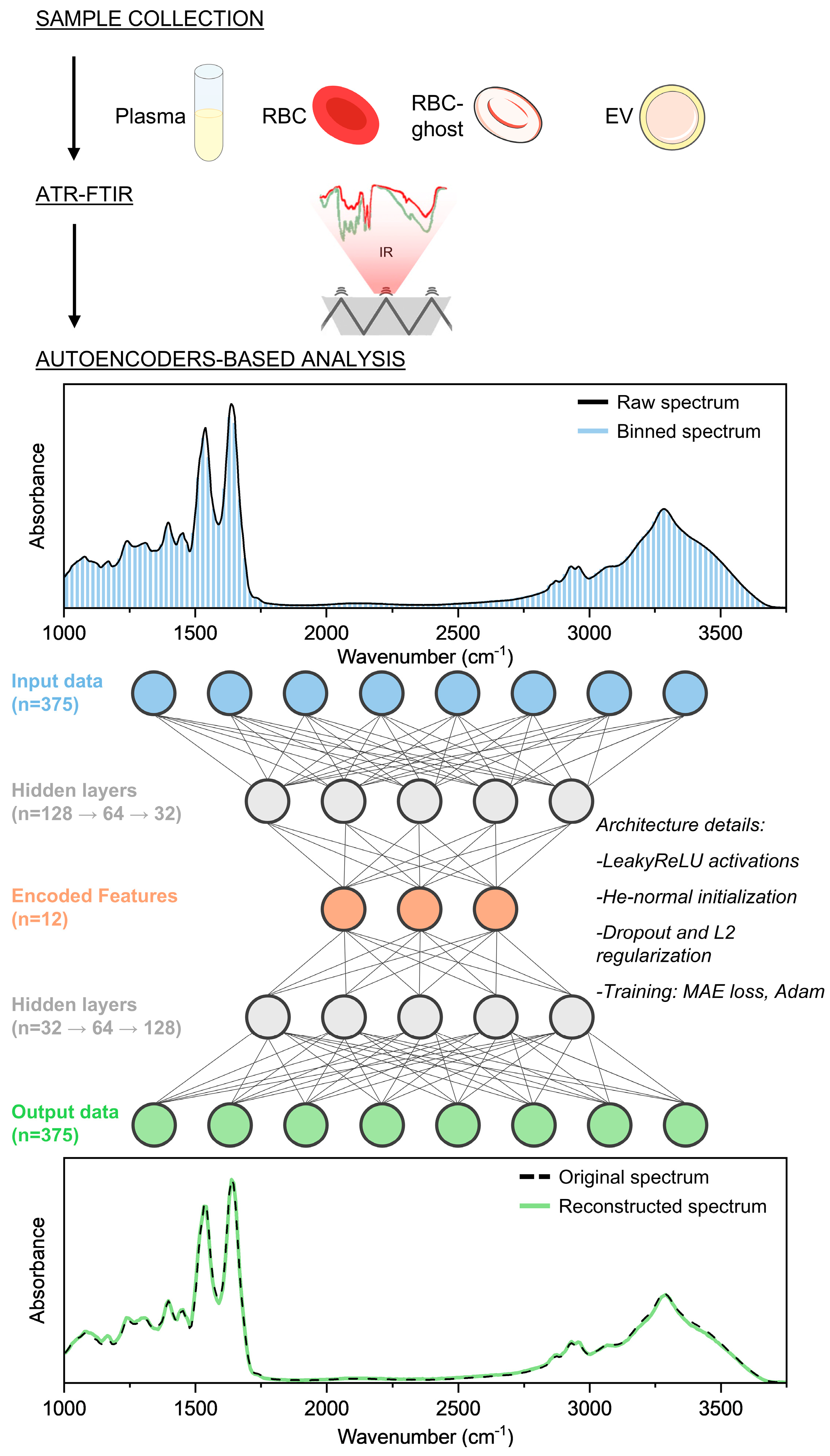 Di Santo, R.; Niccolini, B.; Rosa, E.; De Spirito, M.; Pizzolante, F.; Pitocco, D.; Tartaglione, L.; Rizzi, A.; Basile, U.; Petito, V.; et al. Artificial Intelligence for Liquid Biopsy: FTIR Spectroscopy and Autoencoder-Based Detection of Cancer Biomarkers in Extracellular Vesicles. Cells 2025, 14, 1909. https://doi.org/10.3390/cells14231909