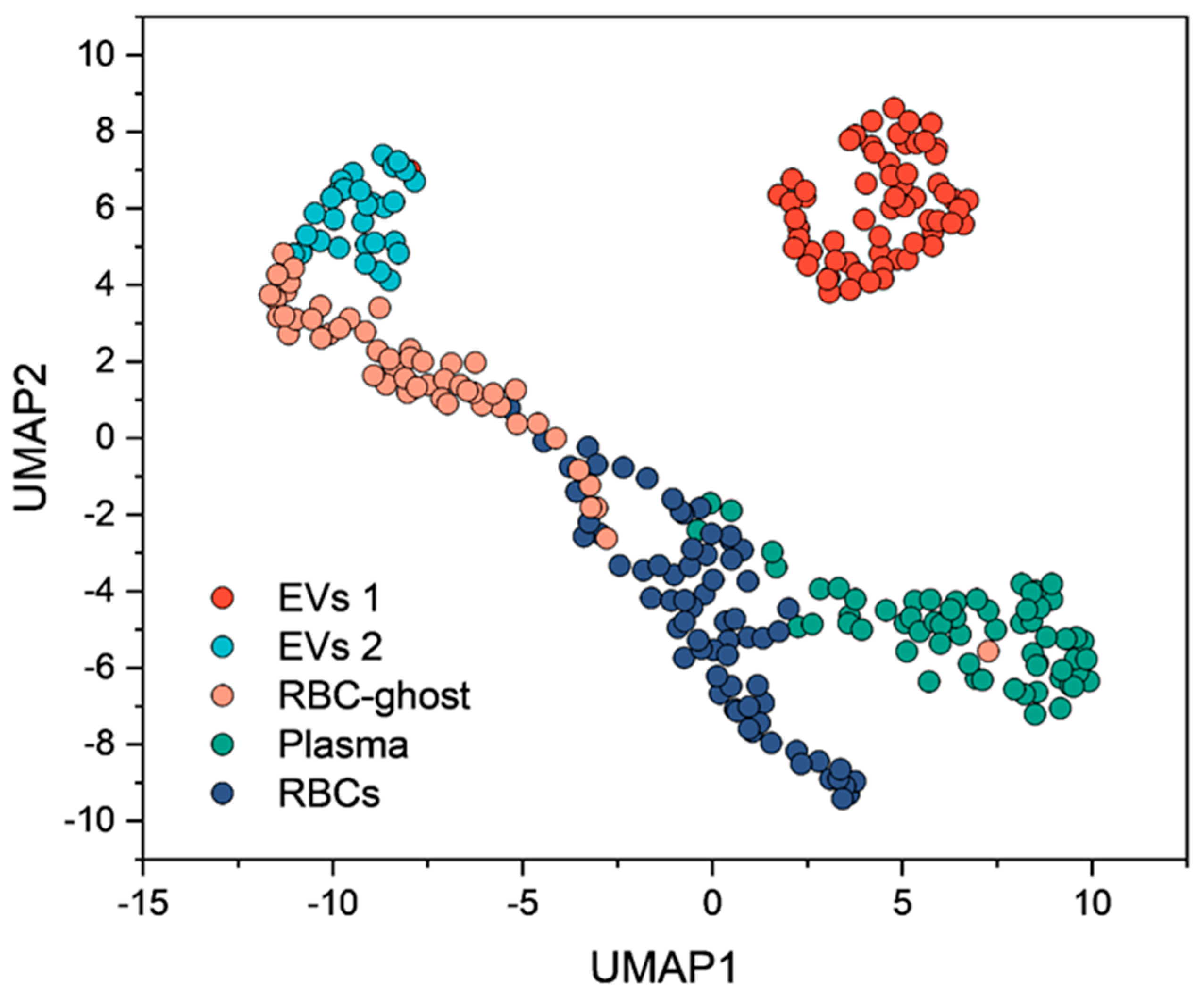 - Jensen, M.N.; Guerreiro, E.M.; Enciso-Martinez, A.; Kruglik, S.G.; Otto, C.; Snir, O.; Ricaud, B.; Hellesø, O.G. Identification of Extracellular Vesicles from Their Raman Spectra via Self-Supervised Learning. Sci. Rep. 2024, 14, 6791. [Google Scholar] [CrossRef] [PubMed]