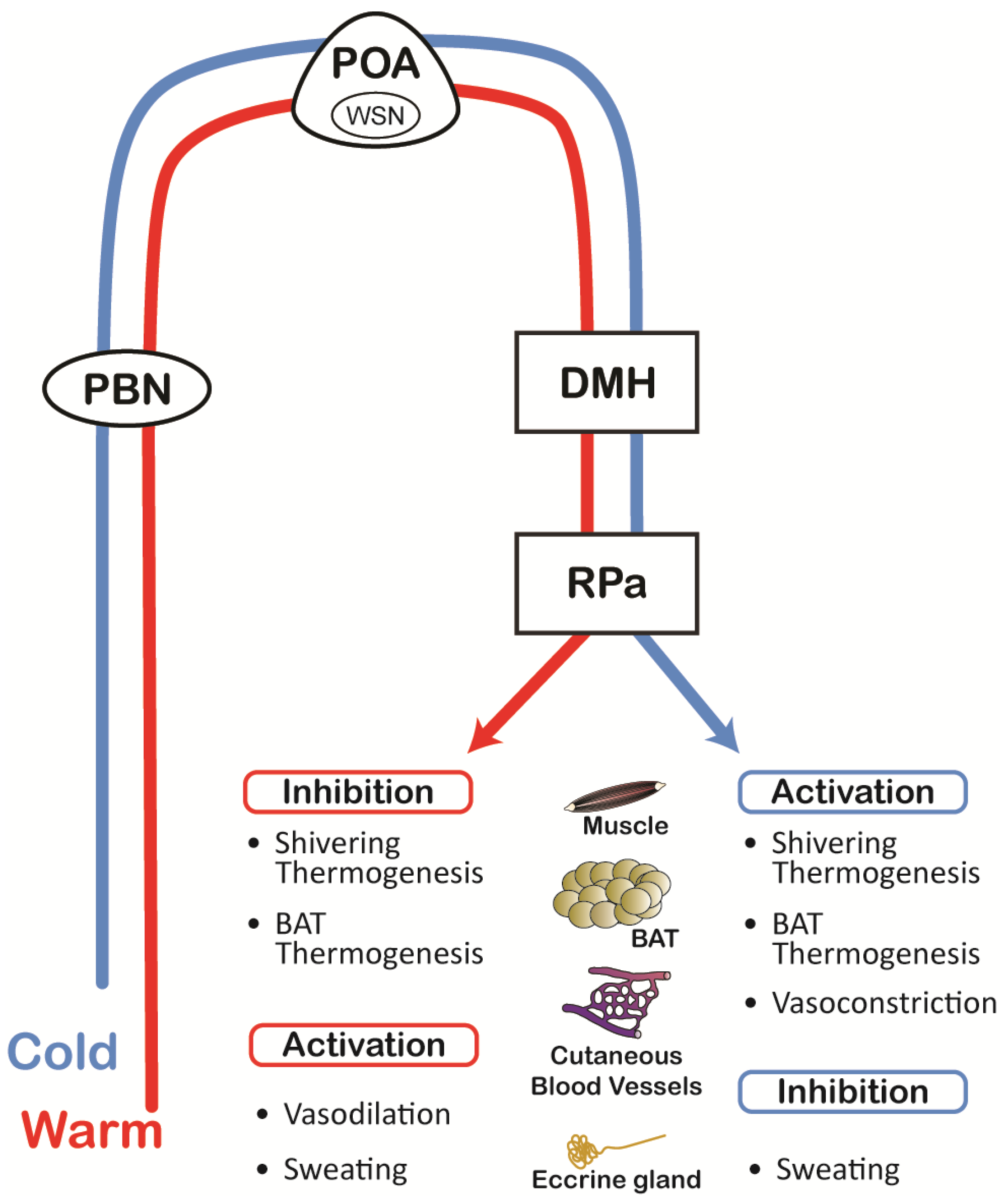 - Yoshida, K.; Li, X.; Cano, G.; Lazarus, M.; Saper, C.B. Parallel preoptic pathways for thermoregulation. J. Neurosci. 2009, 29, 11954–11964. [Google Scholar] [CrossRef] [PubMed] [PubMed Central]