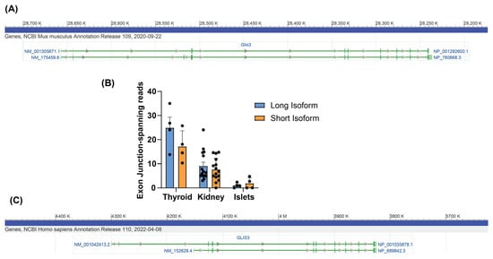 Dysregulated splicing events have been implicated in various pathologies, including cancer and neurological disorders [25,26]. AS also plays a critical role in the regulation of pancreatic β cell functions, and its dysregulation has been associated with the pathophysiology of pancreatic cells and shown to increase during islet inflammation [27]. GLIS3 is critical for the generation and regulation of pancreatic β cell functions, while deficiency in GLIS3 causes neonatal diabetes [4,5,6,9,10,11,19]. This raised the possibility that changes in GLIS3 isoform expression may have a role in the pathophysiology of diabetes. However, we did not observe a difference in the relative expression of Glis3 isoforms between wild-type and db/db mice, a model for Type 2 diabetes (Supplementary Figure S2). It is possible that Glis3 alternative splicing is regulated under different developmental or pathological conditions. Considering the multitude of tissues and developmental stages in which Glis3 is expressed, future studies across all tissues might provide insights into the regulation and functions of the two isoforms.