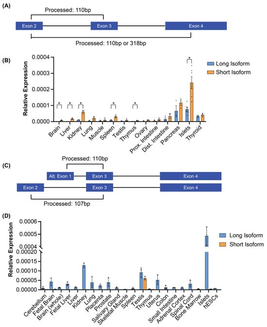 To examine the expression of the long and short Glis3 isoforms identified in Figure 1, qPCR primers were designed to distinguish the two isoforms (Figure 2A). As it is possible for the primer ending in exon 4 to also amplify a larger product including exon 3, we limited the extension time of the PCR and therefore did not detect this larger product (Supplementary Figure S1). Our analysis showed that both Glis3 short and long transcripts were expressed across a variety of mouse tissues (Figure 2B). This analysis further indicated that, while both long and short variants are expressed, the shorter variant appears to be expressed at higher levels than the longer variant in some tissues (brain, liver, kidney, spleen, thymus, and pancreatic islets). Next, we analyzed the expression of the human short and long GLIS3 transcript in several human tissues using respective qPCR primers (Figure 2C). Interestingly, except for the testis, the long isoform was the only isoform detected in all tissues analyzed, including the pancreas (Figure 2D). The latter is consistent with our earlier RNA-seq analysis of human pancreatic islets, in which we were unable to identify alternative exon 1-to-exon 3 spanning reads. Thus, in contrast to mice, human tissues generally express one isoform, except for in the testis.