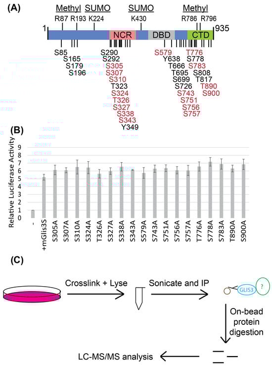 In addition to PTMs, RIME (Figure 5C) identified several new GLIS3-interacting proteins (Supplementary Tables S2 and S3) in addition to the few reported previously [31,32,33,34]. This included proteins that are known to be part of co-activator (e.g., EP300, TRRAP, NCOA1, MED16) or co-repressor (e.g., SIN3A, NCOR1, NACC1, HDAC3) complexes. This is consistent with our previous studies showing that GLIS3 can activate and repress gene transcription [1,2]. Consistent with previous studies showing that GLIS3 can be ubiquitinated and sumoylated, RIME further identified several proteins (e.g., USP7, PIAS2, CUL2, USP34, TRIM33) involved in ubiquitination/sumoylation, suggesting possible mechanisms for regulating the protein stability of both GLIS3 isoforms. The different isoforms, post-translational modifications, and protein interactions together contribute to the complexity of the regulatory mechanisms that control GLIS3 activity and physiological functions, as well as its role in disease.